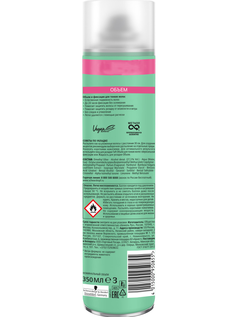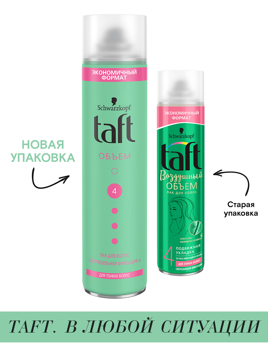 Новый Тафт воздушный Объем благодаря формуле с комплексом коллаген-бамбук придаст волосам невесомый объем от корней за считанные секунды – без утяжеления! Формула Тафт для превосходной фиксации и защиты укладки в любую погоду: от ветра, влажности, УФ-лучей и от влияния загрязнения окружающей среды. Объем и фиксация до 24 часов без склеивания и следов.