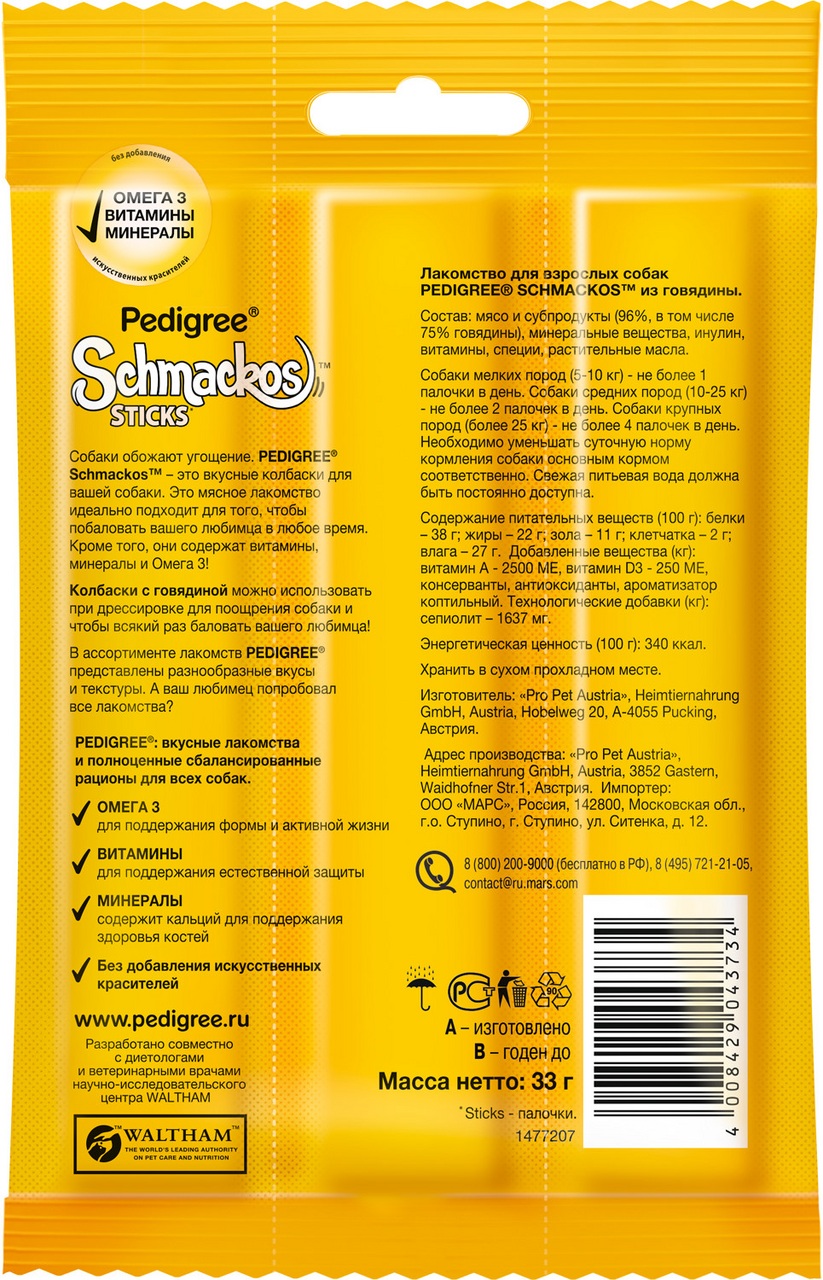 PEDIGREE Schmackos™ – это вкусные колбаски для вашей собаки. Такое мясное лакомство идеально подходит для того, чтобыпобаловать вашего любимца в любое время. Кроме того, они содержат витамины, минералы и Омега 3!