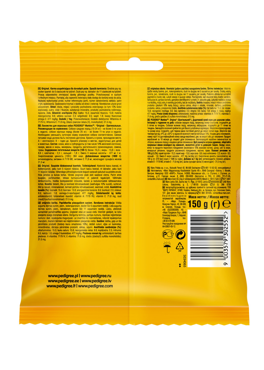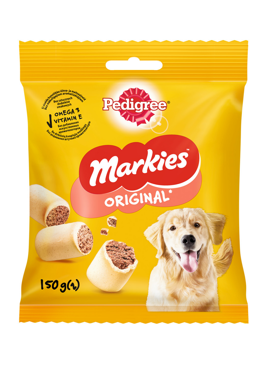 Лакомство для взрослых собак PEDIGREE Markies™ прекрасно подходит для того, чтобы побаловать собаку. PEDIGREE Markies™ рулетики с мозговой косточкой, хрустящие снаружи и такие вкусные внутри. Они доставят удовольствие вашему питомцу и позаботятся о его здоровье. Входящие в состав витамины и микроэлементы помогают поддерживать зубы, кожу и шерсть собаки в отличном состоянии.