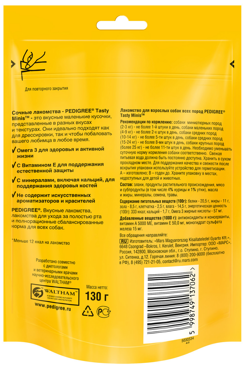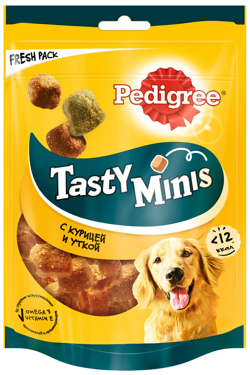 Ароматные кусочки PEDIGREE Tasty Minis с курицей и уткой — отличное угощение в любое время. Аппетитные маленькие кусочки идеально подходят, чтобы побаловать вашего любимца. В состав PEDIGREE Tasty Minis входит кальций, который поддерживает здоровье костей, витамины, обеспечивающие естественную защиту, и омега 3 для активной жизни вашего любимца. Упаковку PEDIGREE Tasty Minis с замком можно открывать и закрывать когда удобно.