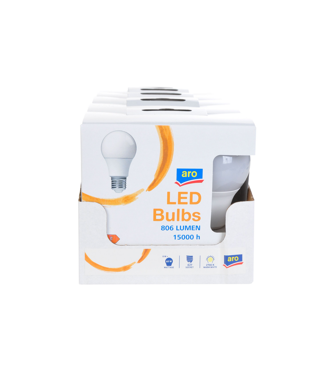 Aro Лампа LED груша 8,5W E28 холодный свет 2 шт. – эффективный эквивалент лампочки накаливания на 60 Вт. Модель с колбой грушевидной формы и видом цоколя Е28 моментально загорается, не нуждаясь в прогреве. Она излучает холодный свет с углом направленного пучка 240?С и температурой до 4000 К. Поток 806 люмен обеспечивает качественное освещение большой площади. Средний срок службы LED лампы – 15000 часов, что позволяет сэкономить на оплате коммунальных счетов и намного реже менять источник света. Энергосберегающее изделие рассчитано на работу при напряжении 220-240 В. Приобрести Aro Лампа LED груша 8,5W E27 теплый 2 шт. можно #incity в торговом центре METRO.ARO – это широкий ассортимент продовольственных и непродовольственных товаров базовой потребительской корзины. Продукция выпускается упаковке, удобной для конечного потребителя, а также в больших еще более экономных фасовках для профессиональных клиентов. В некоторых категориях непродовольственных товаров используется бренд Fairline.