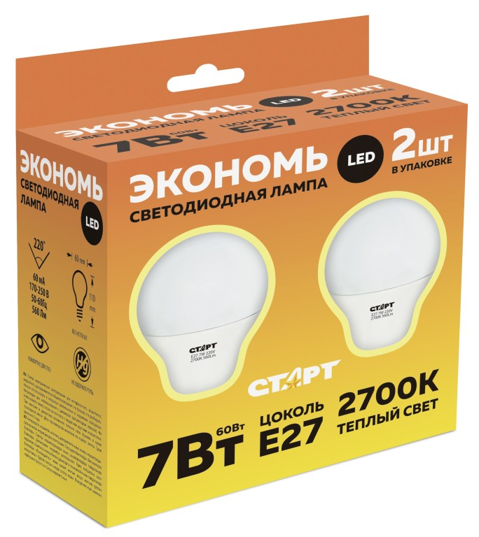Лампа светодиодная Старт LED Старт Eco 7 Вт цоколь E27 груша, 2 шт