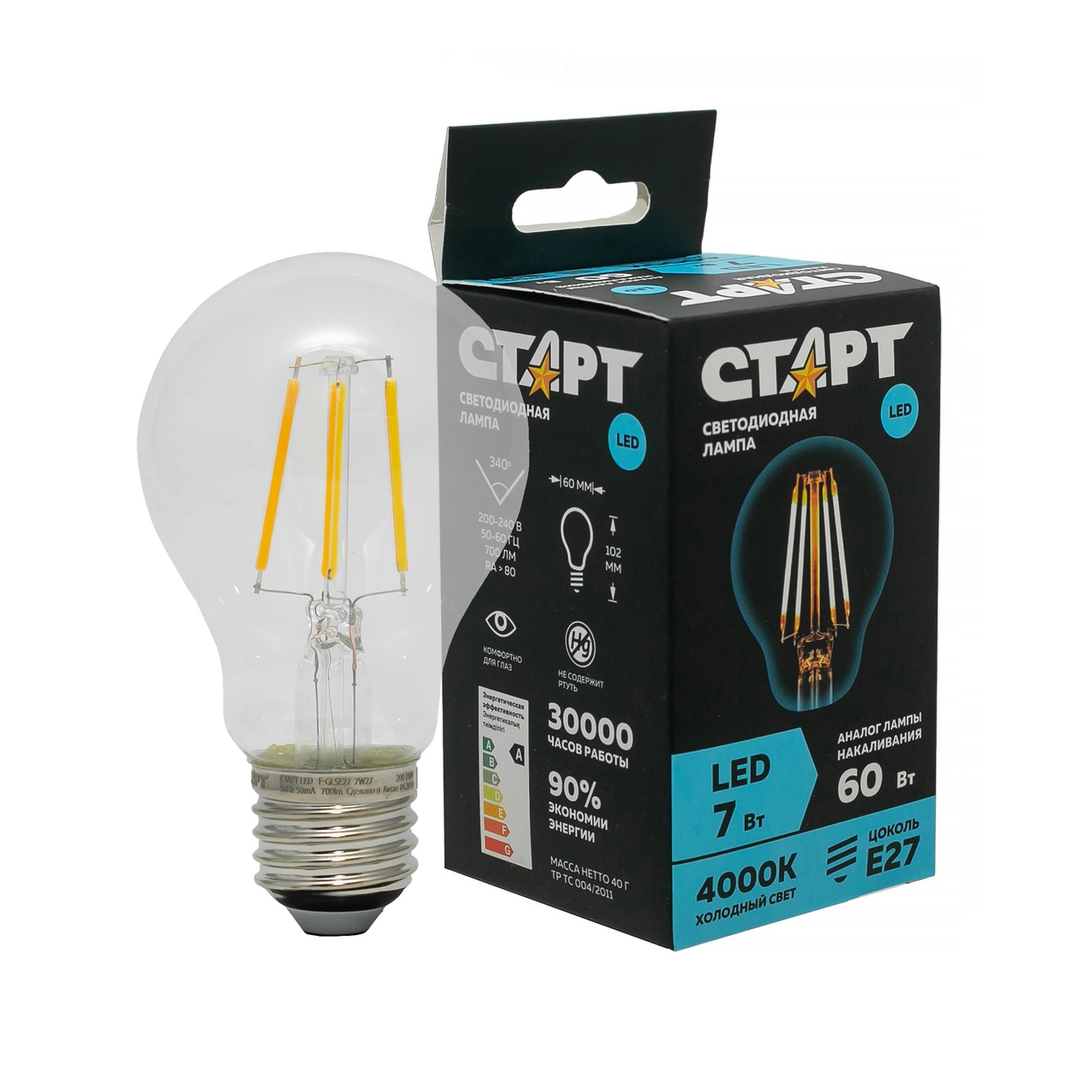 Филаментные светодиодные лампы СТАРТ внешне аналогичны лампам накаливания, но многократно превосходят их по эффективности и экономии энергоресурсов. Данная лампа, благодаря оригинальному дизайну светодиодных нитей, применяется для светового декорирования интерьеров или основного освещения во внутренних помещениях. Матовая шаровидная колба равномерно рассеивает свет на 340. Микроконтроллеры размещены в цоколе и отвечают за защиту лампы от перепадов напряжения и снижение эффекта мерцания. Благодаря низкому нагреву лампа может быть использована в декоративных светильниках с бумажными или тканевыми абажурами. Лампа несовместима с регуляторами яркости. Мощность филаментной лампы всего 7 Вт. Низкий уровень энергопотребления при высокой эффективн��сти позволяет сэкономить до 95% затрат в сравнении с обычными лампами накаливания. Светодиодная лампа имеет продолжительный срок службы, который составляет 30 000 часов.