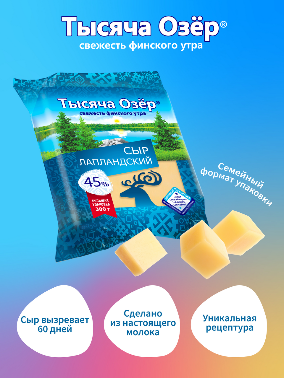 Сыр Тысяча Озер Лапландский 380 г - полутвердый сыр из настоящего коровьего молока, производится по уникальной финской рецептуре. Натуральный сливочный вкус, традиционное качество, срок выдержки 60 дней – вот что определяет нордический характер этого сыра. Сыр отлично подойдет для завтрака в сочетании с морошковым джемом или легкого перекуса, а также для приготовления горячих блюд и закусок.