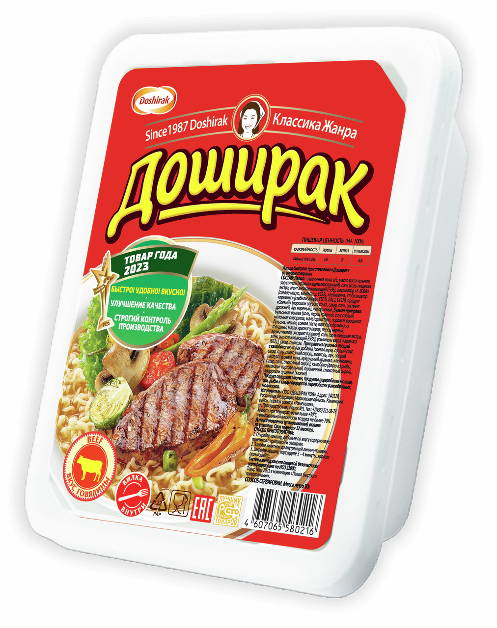 Доширак со вкусом говядины – лапша быстрого приготовления, обогащенная йодом. В приправе из сушеных овощей содержится ламинария, богатая полезными для здоровья минералами и витаминами, благодаря которым нормализуется работа щитовидной железы, улучшаются обменные процессы в организме, нормализуется работа сердечно-сосудистой системы, восстанавливается витаминный баланс, снижается ур��вень холестерина, выводятся радионуклиды и токсины, укрепляется иммунитет.