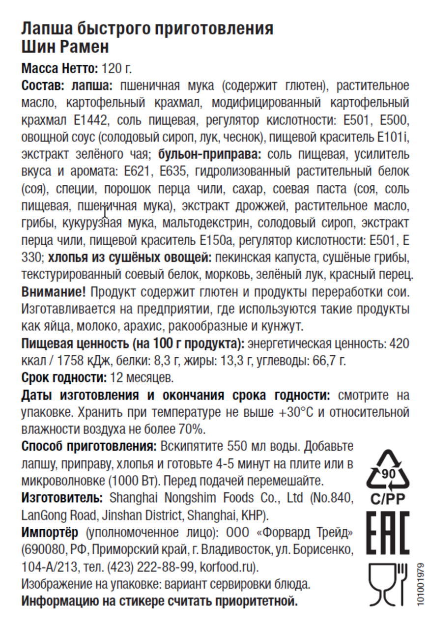 Лапша Nongshim Шин Рамен – острая, ароматная и горячая паста, которая быстро утолит голод и согреет в холодный день. В ее состав входят овощные и грибные хлопья, а насыщенный и терпкий бульон умами содержит соевый соус, экстракты анчоуса и ламинарии. За остроту блюда отвечает тщательно подобранный букет специй – перец чили, лук и чеснок, имбирь и редька делают лапшу пикантной и обжигающей. На основе Шин Рамен легко создавать сытные супы в азиатском стиле, а также использовать в качестве гарнира к мясным блюдам.