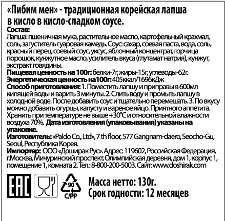 Корейская лапша для варки Пибим Мён в кисло-сладком соусе - оригинальная премиальная лапша из Кореи. Идеальный баланс вкусов - соленое, сладкое, кислое и острое гармонично сочетаются в одном блюде. Соус сочетает в себе сладкий вкус, пикантную кислинку и умеренную остроту, придавая лапше неповторимый аутентичный вкус и аромат. Можно употреблять как отдельное блюдо, а можно как гарнир к мясу.