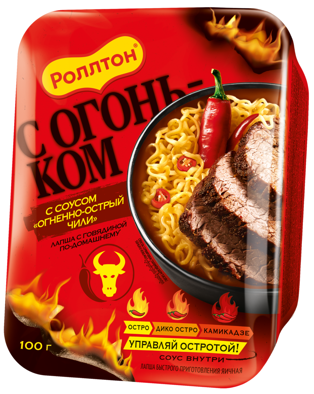 Выйди на новый уровень остроты, попробуй Роллтон С огоньком. Супер-острый соус, который позволит прочувствовать огненный перчик чили по полной. Управляй своей остротой, выбирая сколько соуса тебе добавить. Это макаронное изделие быстрого приготовления с добавлением кусочков говядины, пряностей, чеснока. Вы сами можете выбрать сделать лапшу острой или более мягкой по вкусу используйте для этого соус с перцем чили. Быстрота и легкость в приготовлении способствуют ее популярности у разных категорий покупателей. Ее берут в поездки, походы или для перекуса на работе.