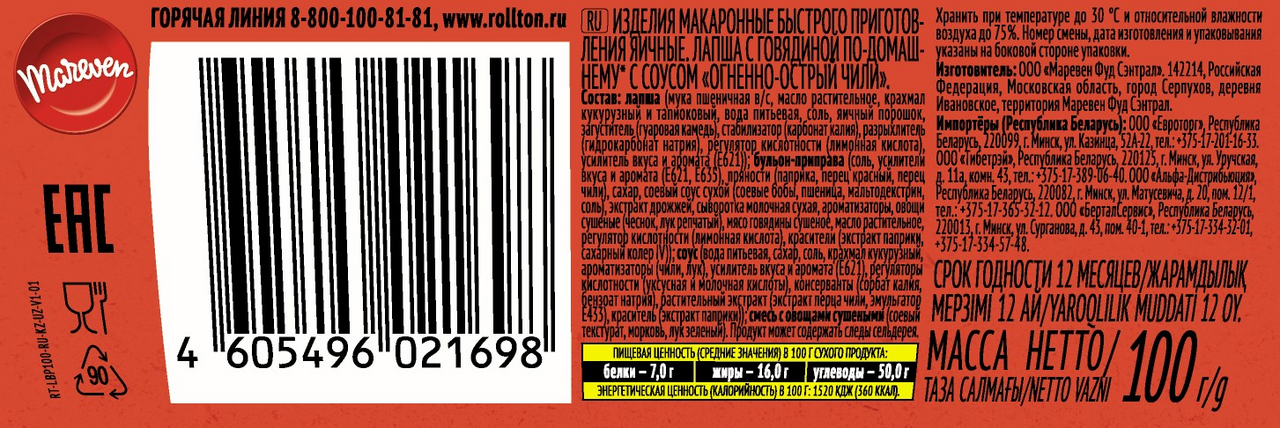 Лапша (мука пшеничная высшего сорта, масло растительное, крахмал кукурузный и тапиоковый, вода питьевая, соль, яичный порошок, загуститель (гуаровая камедь), стабилизатор (карбонат калия), разрыхлитель (гидрокарбонат натрия), регулятор кислотности (лимонная кислота), усилитель вкуса и аромата (Е621)), бульон-приправа (соль, усилители вкуса и аромата (Е621, Е635), пряности (паприка, перец красный, перец чили), сахар, соевый соус сухой (соевые бобы, пшеница, мальтодекстрин, соль), экстракт дрожжей, сыворотка молочная сухая, ароматизаторы, овощи сушеные (чеснок, лук репчатый), мясо говядины сушеное, масло растительное, регулятор кислотности (лимонная кислота), красители (экстракт паприки, сахарный колер IV)), соус (вода питьевая, сахар, соль, ароматизаторы (чили, лук), крахмал кукурузный, усилитель вкуса и аромата (Е621), регуляторы кислотности (уксусная и молочная кислоты), консерванты (сорбат калия, бензоат натрия), растительный экстракт (экстракт перца чили, эмульгатор Е433), краситель (экстракт паприки)), смесь с овощами сушеными (соевый текстурат, морковь, лук зеленый).
