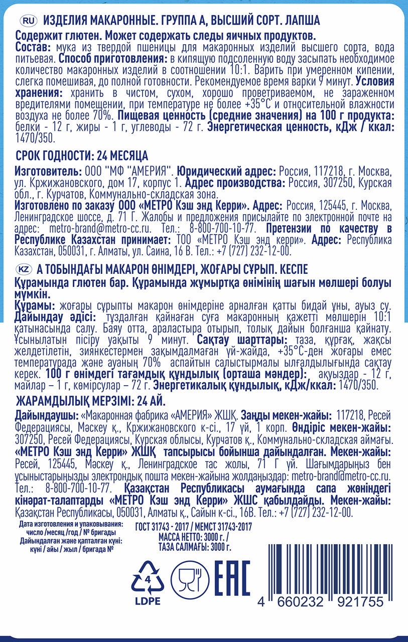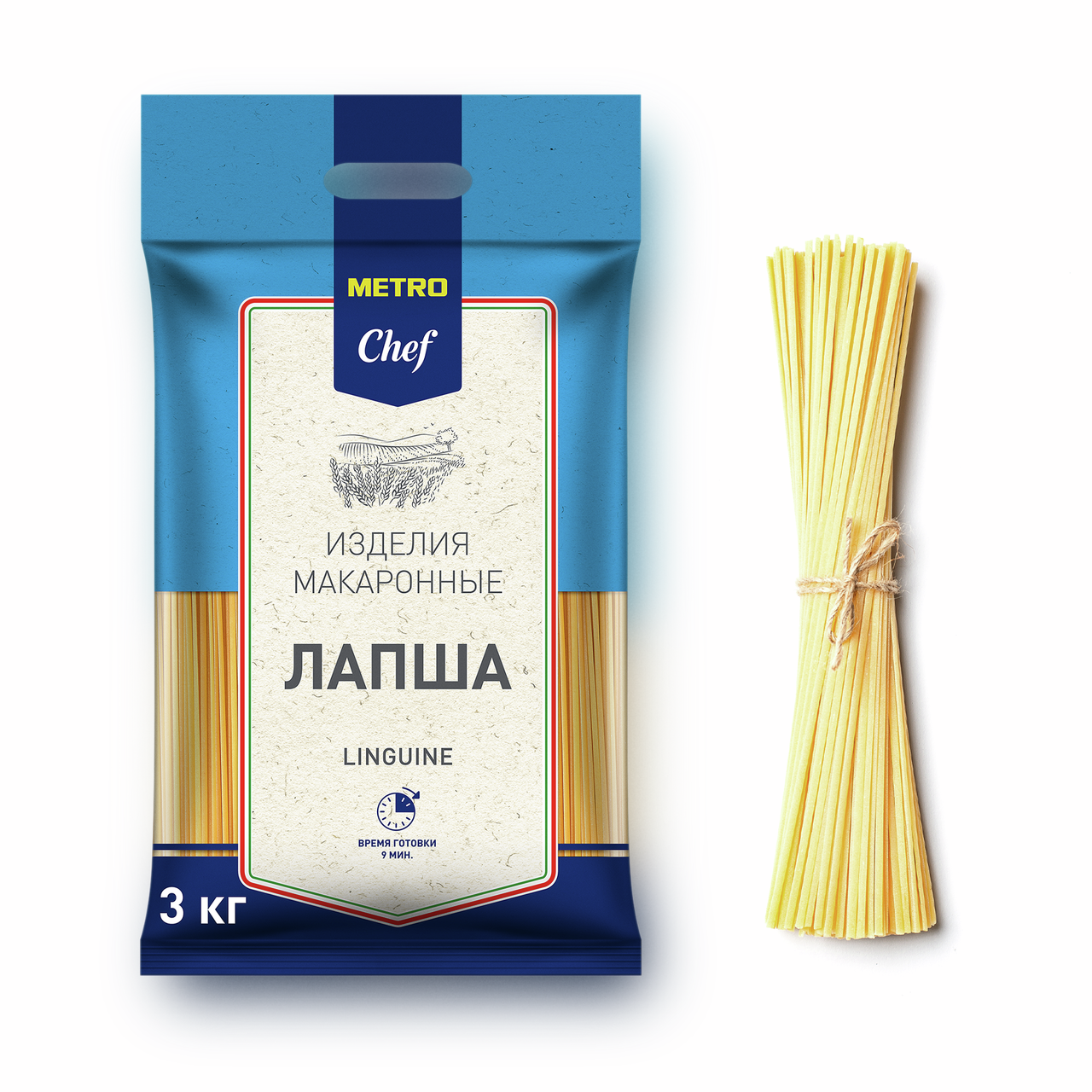 Лапша – разновидность макаронных изделий. Она представляет собой длинные и узкие полоски теста, приготовленного из пшеничной муки и воды. Время приготовления лапши составляет 5-12 минут. Готовый продукт не слишком мягкий, он не прилипает к стенкам кастрюли. В процессе варки макаронные изделия необходимо периодически помешивать. В конце кулинарного процесса их можно промыть, но профессиональные повара не рекомендуют этого делать, чтобы сохранить вкус и температуру блюда.Купить лапшу, 3 кг вы можете в торговом центре METRO.
