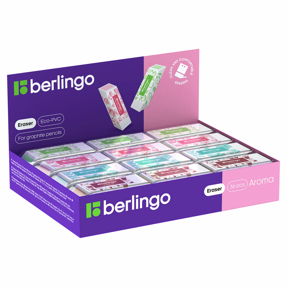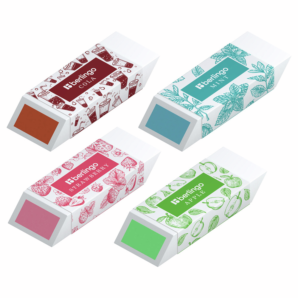 Ластики Berlingo Aroma выполнены из ECO-PVC. Ароматизированные, 4 запаха - мята, кола, клубника, яблоко. Не токсичны. Прекрасно справляются с линиями от чернографитного карандаша, не оставляют следов и грязных разводов после себя.
