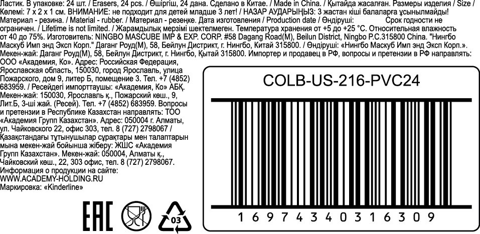 Ластик Colorio прямоугольный, 70 x 20 x 10мм
