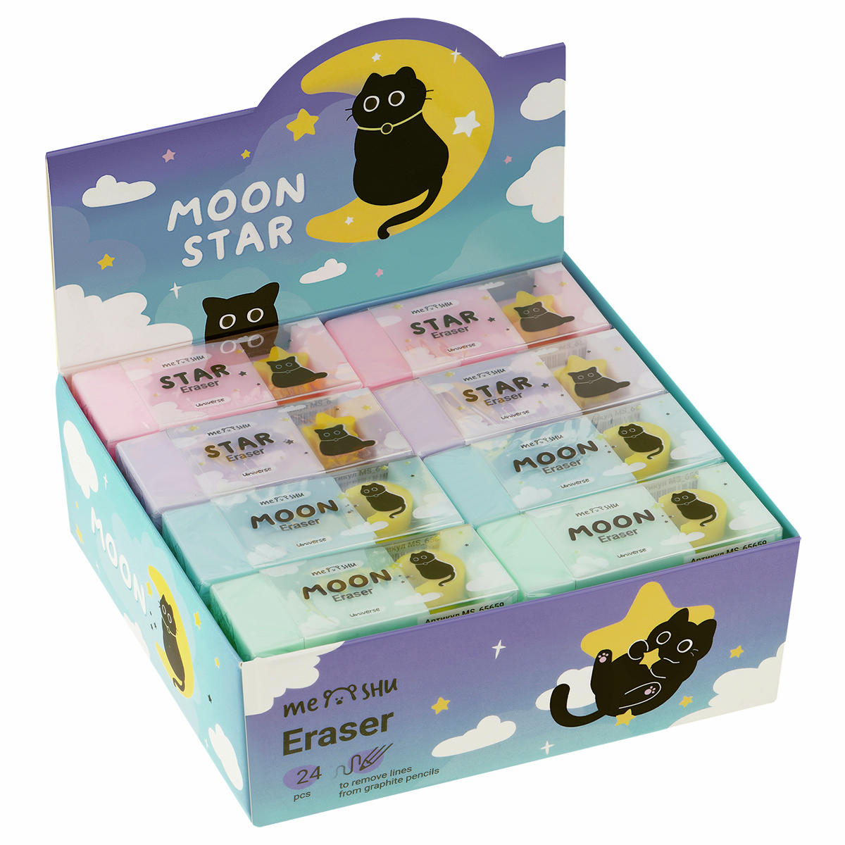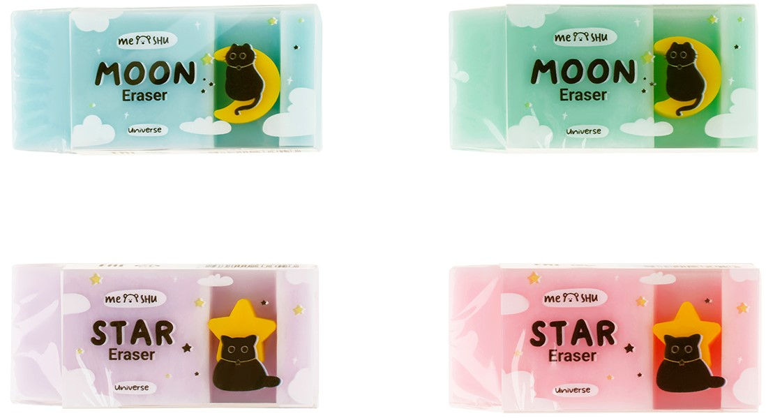 Ластик Meshu Universe - милый помощник в учёбе и работе. Прямоугольный ластик из ПВХ и отлично стирает чернографитный карандаш. В дисплей-боксе представлено ассорти из 4 дизайнов ластика пастельных оттенков с рисунком котят. Размер - 61x26x14мм. Ластики упакованы в бокс по 24шт. Каждый из них индивидуально защищён ПВХ-обечайкой и упакован в плёнку.