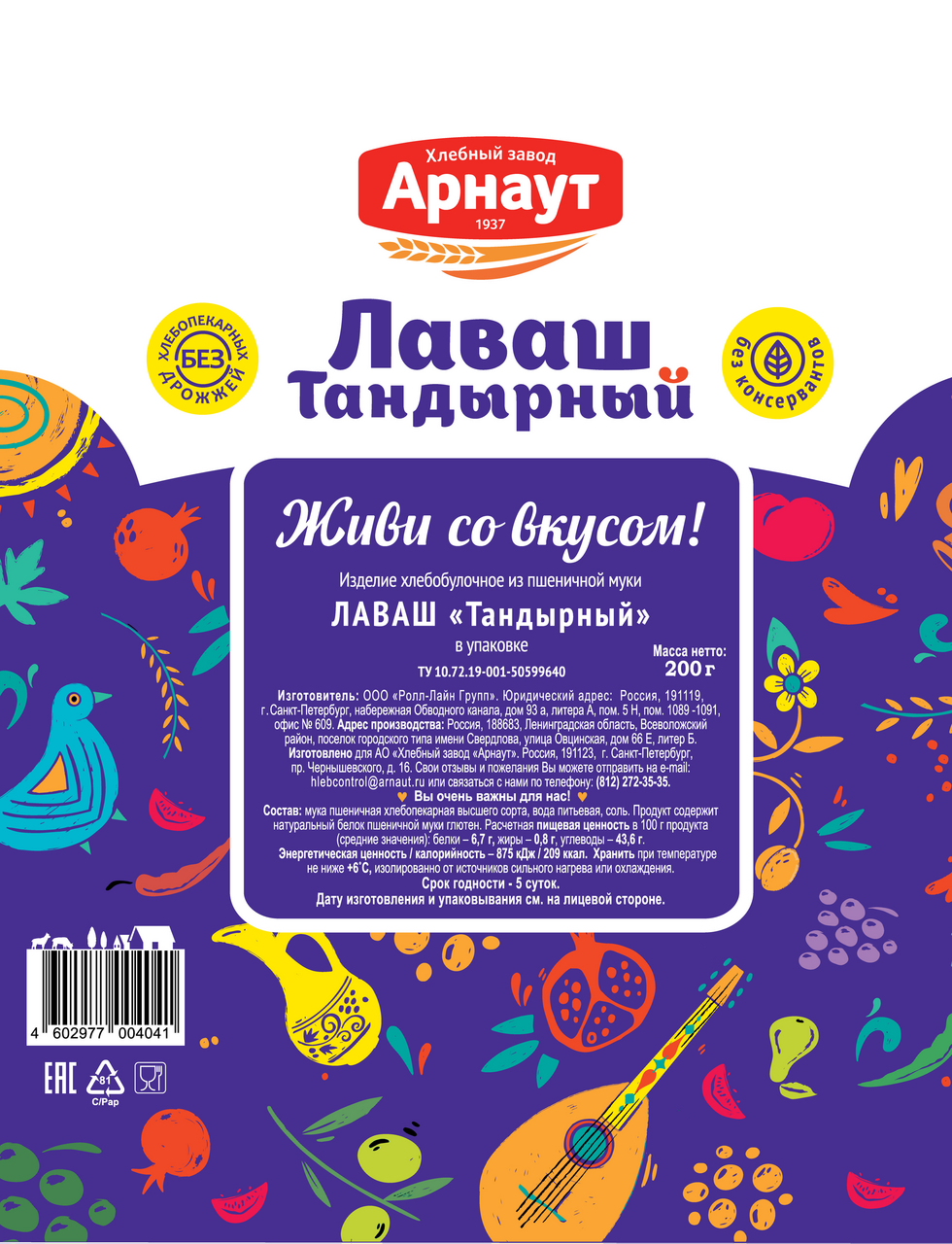 Изделие хлебобулочное из муки высшего сорта. Представляет собой пресный белый хлеб в виде тонкого полотна со слегка пузырчатой поверхностью золотистого цвета, аккуратно сложенный в несколько слоев и упакованный в бумажный пакет с прозрачным окном. Обладает классическим вкусом, его можно использовать вместо привычного хлеба или как основу для разных блюд.