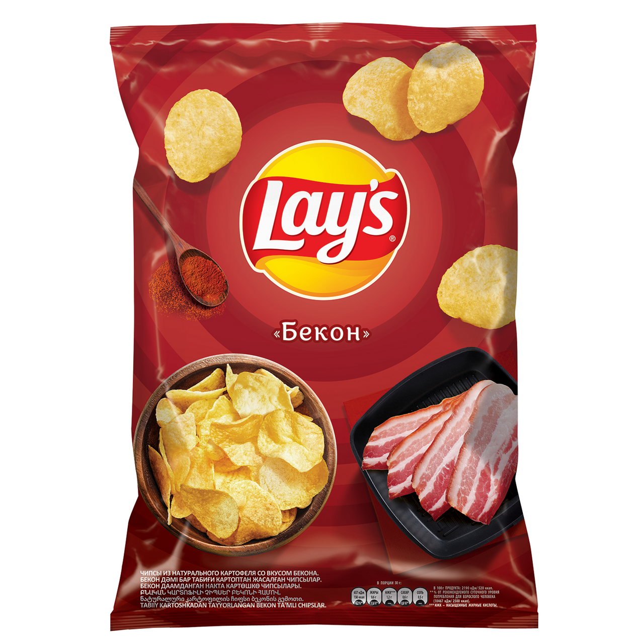 "LAY'S— чипсы, каждая пачка которых изготовлена изспециально отобранного картофеля исоответствует самым высоким стандартам качества. Хрустящие илегкие навкус картофельные чипсы LAY'Sбыли созданы, чтобы вызвать улыбку налице каждого человека, поэтому ими так приятно делиться случшими друзьями. Чипсы LAY'S, несомненно, скрасят ваш день!●Вкус бекона, поджаренного дозолотистой корочки, всочетании схрустящей картошечкой— это особое удовольствие для настоящих ценителей."