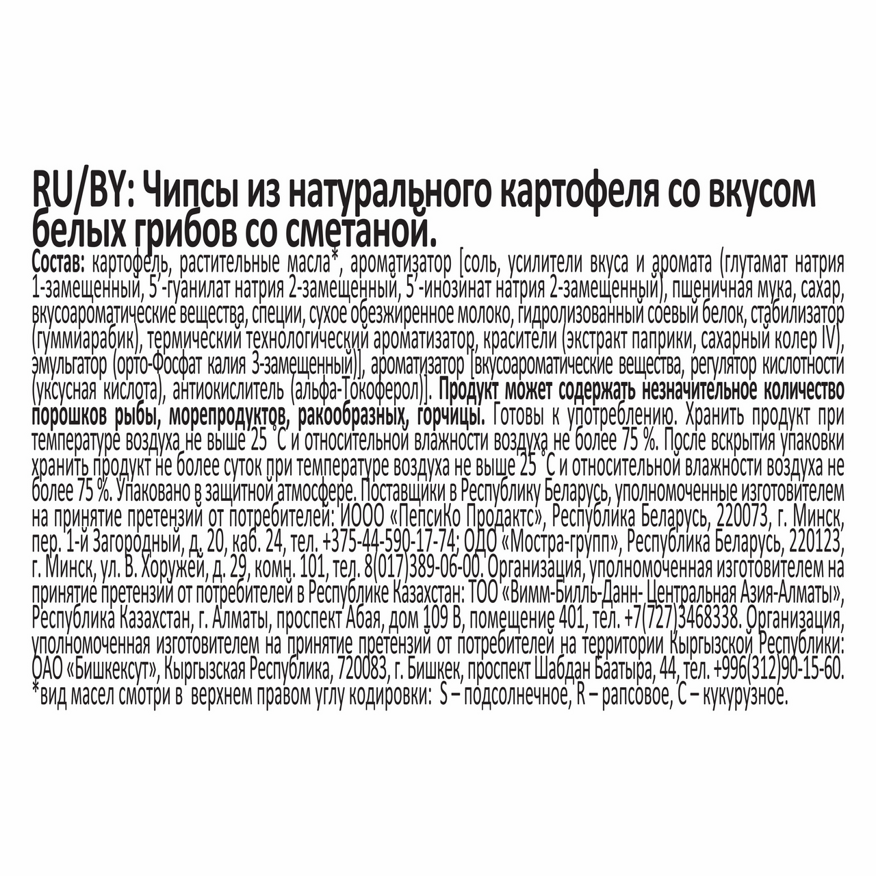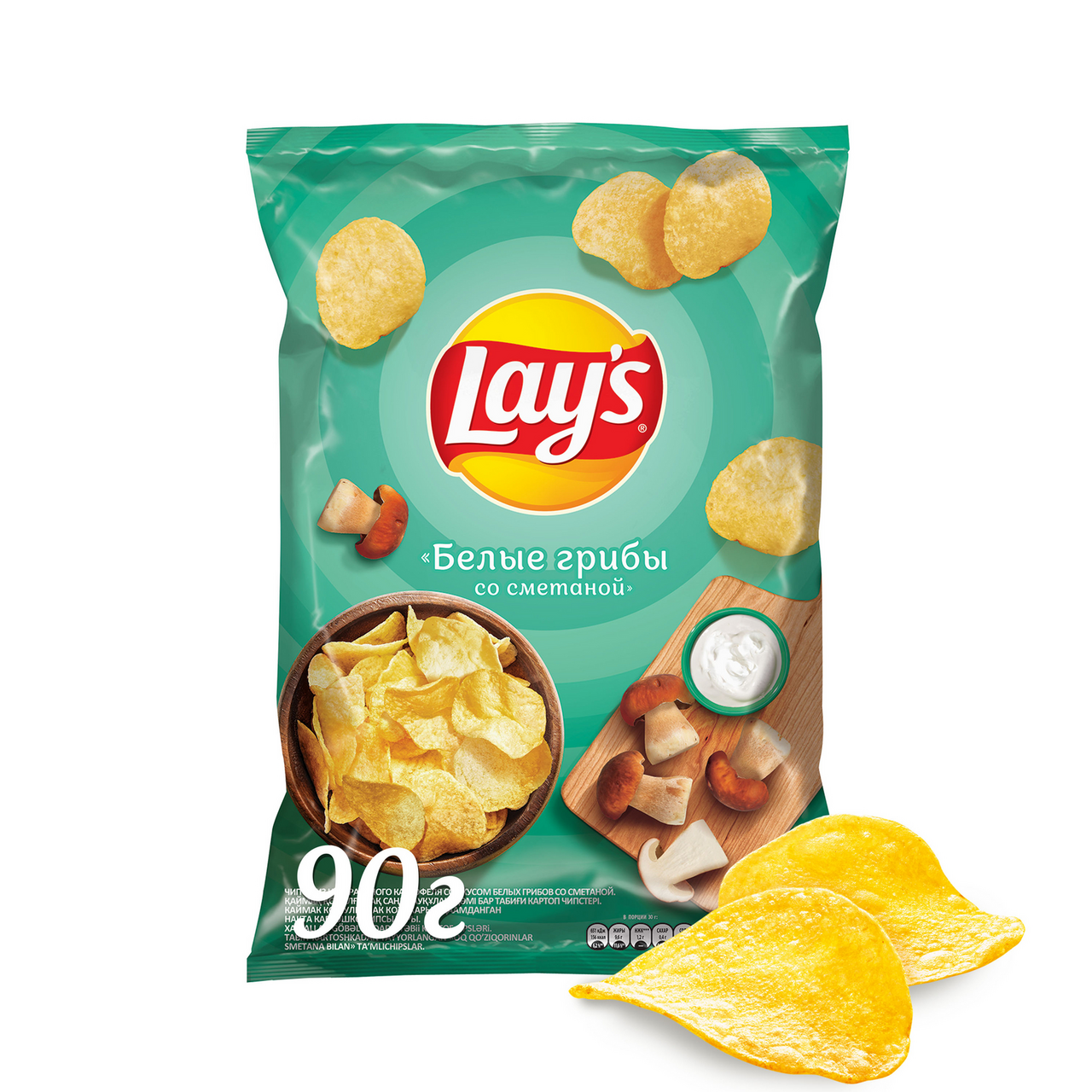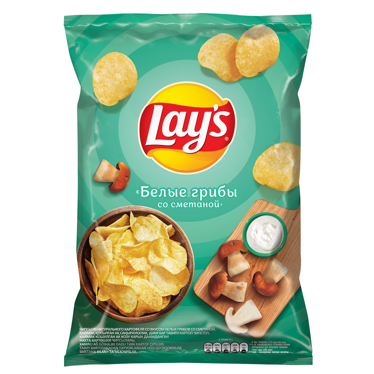 "LAY'S— чипсы, каждая пачка которых изготовлена изспециально отобранного картофеля исоответствует самым высоким стандартам качества. Хрустящие илегкие навкус картофельные чипсы LAY'Sбыли созданы, чтобы вызвать улыбку налице каждого человека, поэтому ими так приятно делиться случшими друзьями. Чипсы LAY'S, несомненно, скрасят ваш день!●Хрустящие LAY'Sсовкусом белых грибов исметаны— это особенное наслаждение! Изумительный вкус золотистой поджаренной картошечки ибелых грибов, тушеных всметане, никого неоставит равнодушным. Устоять невозможно!"