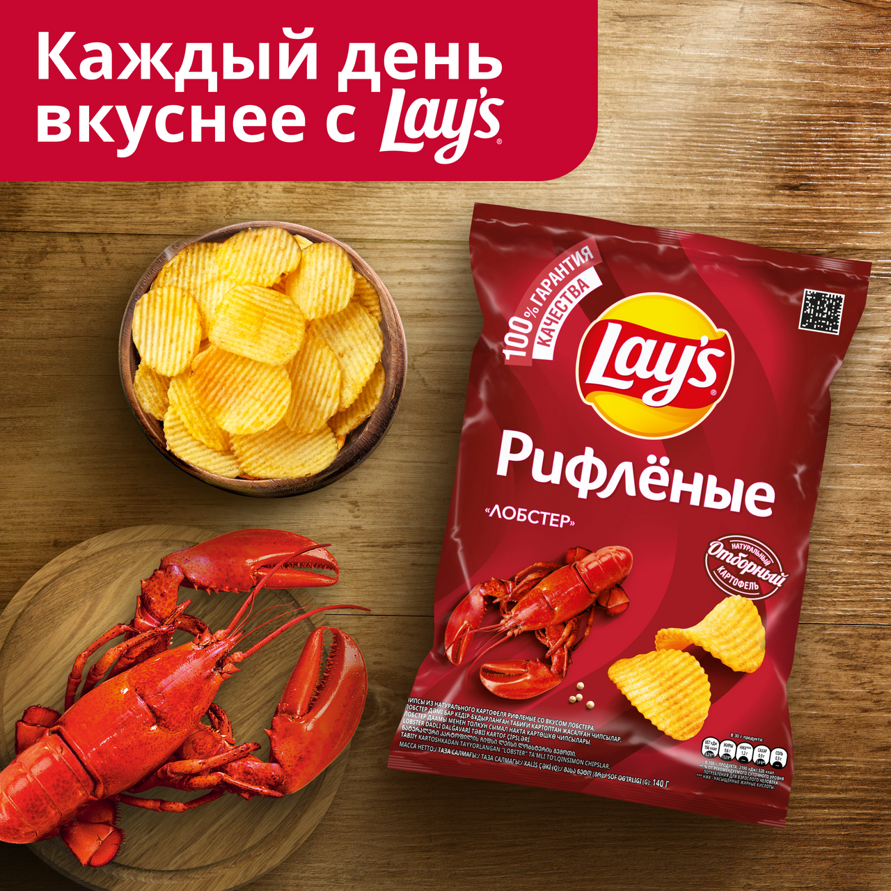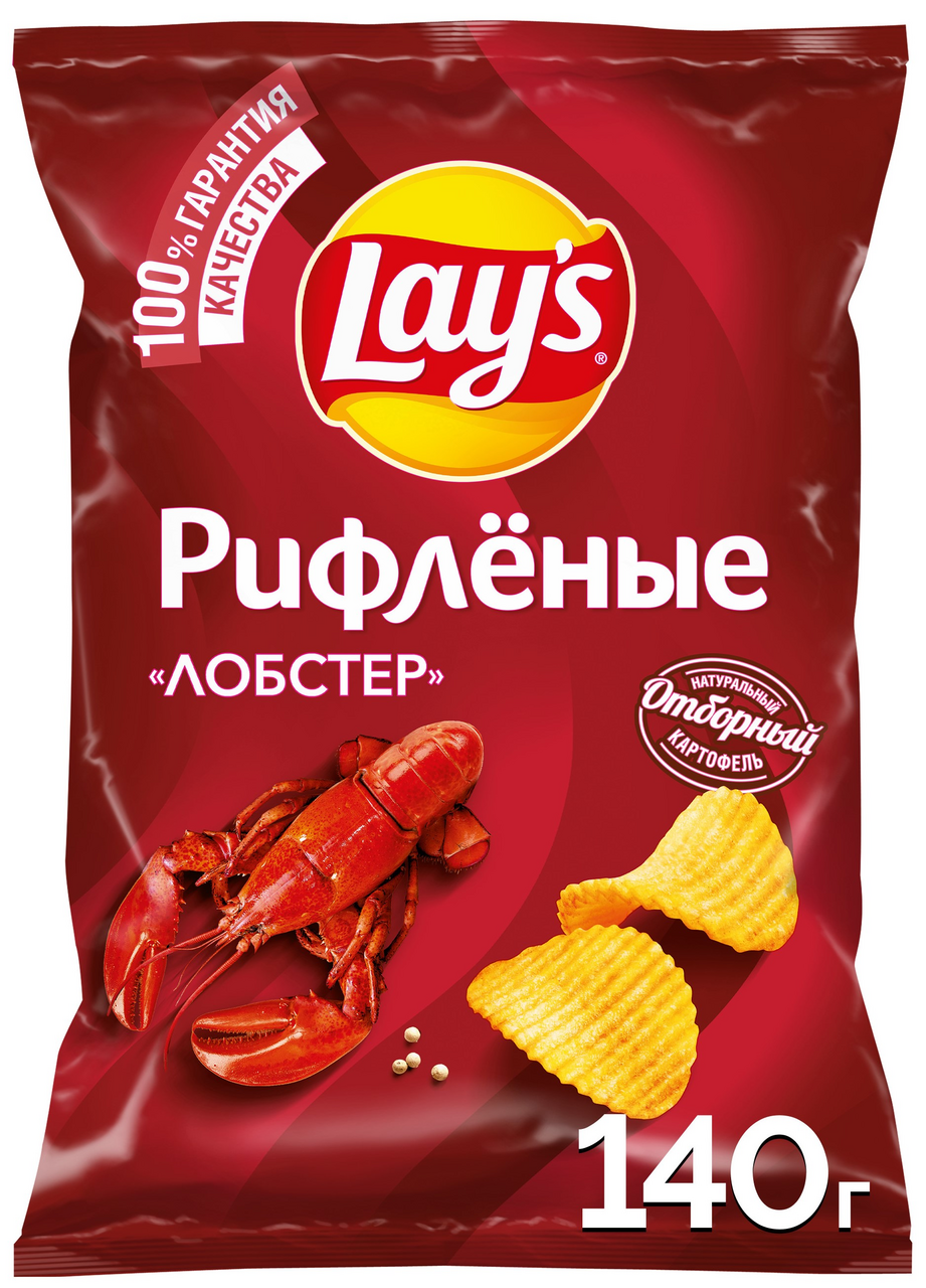 Чипсы Lays рифленые лобстер, 140г готовятся из отборных качественных ингредиентов. Имеют насыщенный вкус морепродуктов, приятный картофельный аромат, легкую и хрустящую структуру, которая понравится каждому, кто захочет их попробовать. Их можно подать для перекуса со сливочным соусом или предложить гостям в качестве закуски к слабоалкогольным напиткам, так и сладкой газированной воде. Чипсы можно использовать и для эффектной сервировки салатов, соусов и паштетов. В таком случае они получатся порционными. Это очень удобно — взял одну штучку и съел, не испачкав руки и посуду. Гостям понравится такой способ подачи. Большой упаковки хватит на всю компанию, ведь чипсами хочется поделиться со всеми. Они незаметно исчезают из тарелки во время просмотра интересного фильма или захватывающего футбольного матча. Пластиковый пакет сохраняет свежесть и потребительские качества, не допуская попадания влаги внутрь.