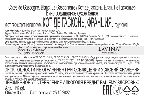 Вино PLAIMONT Le Gasconierre Blanc белое сухое, 0,75 л отличается красивым золотисто-соломенным оттенком с нежными зеленоватыми отблесками. Оно создано из спелых плодов уни блан и коломбар. Ягоды выращивают на юго-западе Франции, в Гаскони, и бережно собирают вручную в период полной зрелости в ночное время суток. Такая технология позволяет максимально сохранять природную свежесть и натуральный ягодный вкус в будущем напитке, приготовленном в соответствии с традиционными рецептами виноделия.Белое вино обладает насыщенным и сложным ароматическим букетом. В нем органично сплетаются фруктовые и ягодные нотки лайма, крыжовника, алычи и белой смородины, манго, абрикоса, грейпфрута и ананаса. Вкус освежает сочной гармонией цитрусовых и фруктовых переливов, дарит приятное и стойкое послевкусие с акцентом ананаса и минеральными полутонами.Перед сервировкой вино рекомендуется охладить до температуры 10-12 С. Его подают в бокалах тюльпановидной формы, предлагая в качестве легкого аперитива или в сопровождении с блюдами и закусками из рыбы, курицы и морепродуктов, салатами из овощей или козьими сырами. Приобрести вино PLAIMONT Le Gasconierre Blanc белое сухое, 0,75 л можно в торговом центре METRO. Меры предосторожности: алкоголь противопоказан детям и подросткам до восемнадцати лет, беременным и кормящим женщинам, лицам с заболеваниями центральной нервной системы, почек, печени и других органов пищеварения. Чрезмерное употребление алкоголя вредит вашему здоровью.