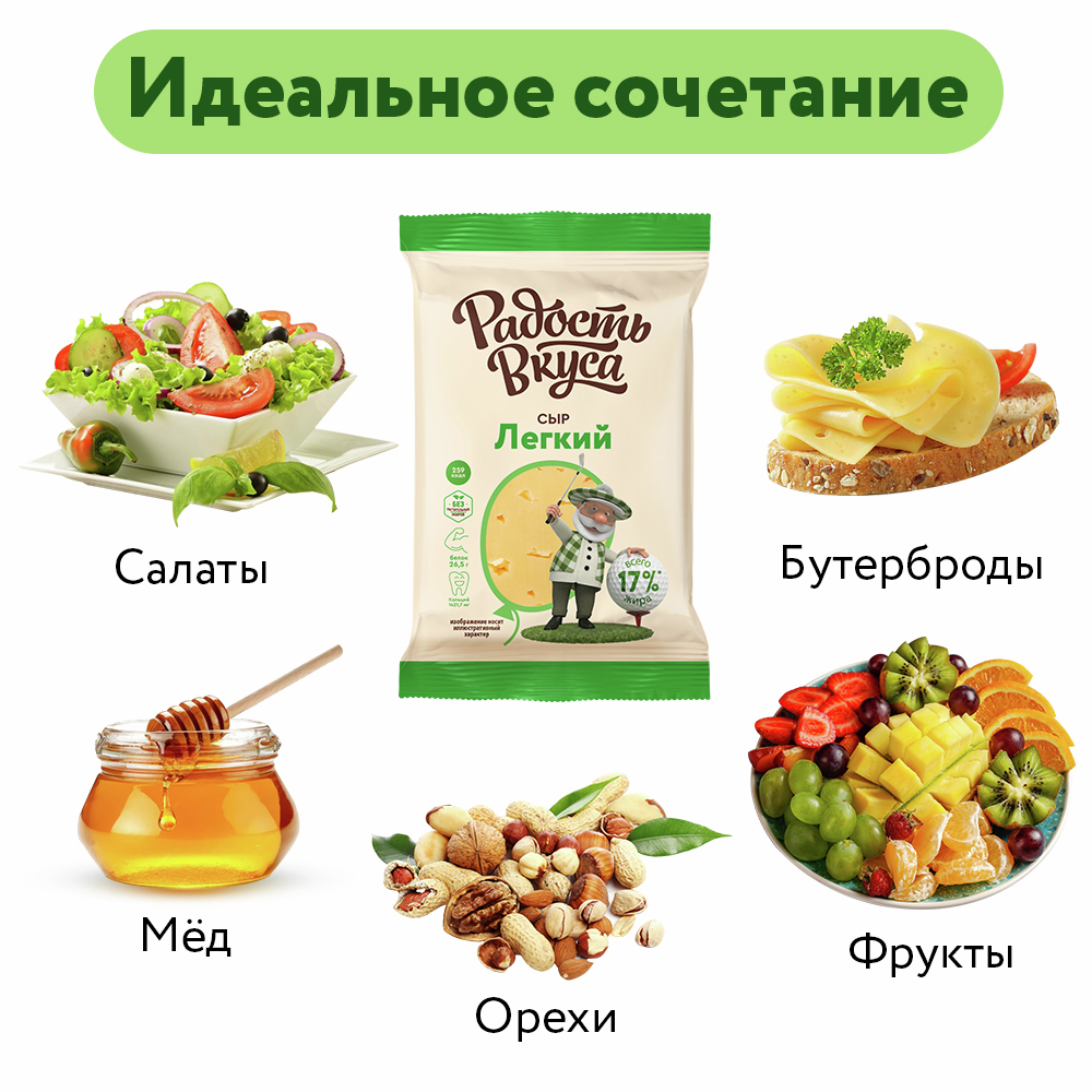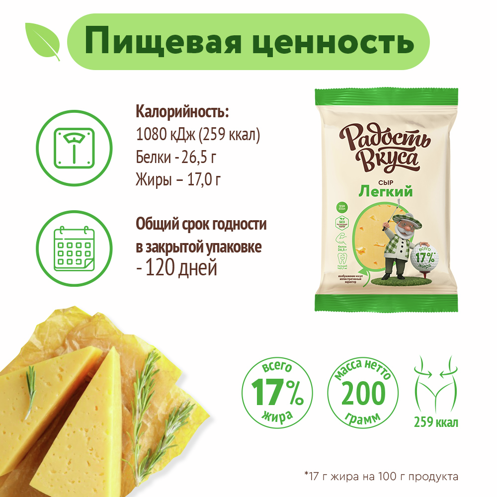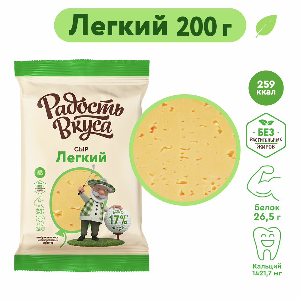 Сыр Легкий Радость Вкуса имеет пониженное содержание жира, но при этом технологи попытались сохранить вкус и пользу продукта. Подходит для легкого перекуса, завтрака, приготовления разных блюд. Правильное питание может быть вкусным вместе с сыром Легкий!