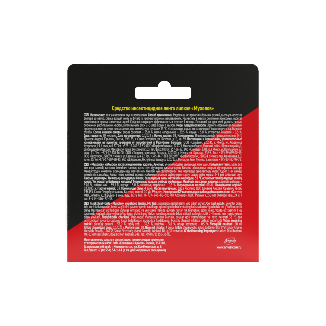 Формула невысыхающего клея обеспечивает долговременную эффективность при различной температуре и влажности. Лента защищает также от фруктовых мушек и пищевой моли. Липкая лента от мух предназначена для уничтожения мух в помещениях.