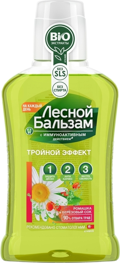 Профилактический ополаскиватель Лесной бальзам Тройной эффект с ромашкой и облепихой содержит 90% отвара трав, имеет мягкий травяной вкус и сочетает в себе сразу 3 действия, позволяя достичь максимальной защиты всей полости рта*:1) Укрепляет десны благодаря запатентованной формуле на отваре трав. Формула усилена сразу тремя фито-экстрактами: березовым соком, соком алоэ и экстрактом ромашки.2) Защищает от кариеса и укрепляет эмаль за счет минерального комплекса с фтором.3) Сохраняет дыхание свежим и защищает от образования налета в течение дня за счет масла мяты.4) Поддерживает баланс микрофлоры полости ртаКлинически доказано: ежедневное использование серии Тройной эффект (зубная паста + ополаскиватель) в 3 раза снижает образование налета на зубах – основной причины кариеса и проблем десен.*Рекомендации:Рекомендован в качестве профилактического средства для укрепления десен.Использовать после каждой чистки зубов, а также после еды для очищения межзубных промежутков. Не требуется полоскать после использования водой. При воспалении десен рекомендуется использовать после каждой чистки зубов, а также тщательно полоскать полость рта после каждого приема пищи. В период ремиссии сохранить использование минимум 1 раз в день для предупреждения развития проблем десен и улучшения питания мягких тканей полости рта.Подходит для использования в ирригаторе.Подходит для использования в период бере��енности и лактации*Максимальная защита всей полости рта в линейке Лесной бальзам. Эффект на 14-й день использования зубной пасты и ополаскивателя Тройной эффект в сравнении с начальным состоянием полости рта, РФ 2013-2016.Не является лекарственным средством. Применение не освобождает от посещения стоматолога.