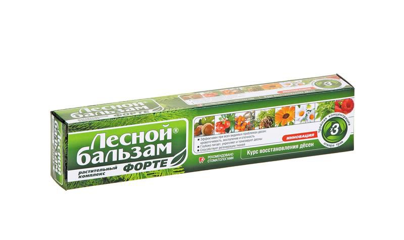 Профилактическая зубная паста Лесной бальзам Форте Актив содержит повышенную концентрацию натуральных экстрактов для усиленного восстановления десен. Зубная паста усилена маслом чайного дерева и уже с первого дня активирует иммунитет полости рта*, повышая естественную защиту зубов и десен от вредных бактерий.Клинически-доказанный эффект*:1) Эффективна с первого применения.2) В 2 раза снижает воспа��ение и кровоточивость десенОсобенности состава:1) В состав зубной пасты входит хвойный комплекс с тройной концентрацией отвара трав и 8 фитоэкстрактов. Богатый растительный состав продукта способствует быстрому снижению воспаления и кровоточивости десен, улучшает питание мягких тканей полости рта.2) Паста имеет насыщенный хвойный вкус с богатым вкусом ягод и лечебных трав. Цвет пасты обусловлен высоким содержанием натуральных экстрактов в составе.3) Зубная паста изготовлена на отваре 5 трав (ромашка, тысячелистник, крапива, зверобой, чистотел). Отвар трав используется взамен обычной воды и получается в результате низкотемпературной экстракции (35%), что позволяет достичь максимально полного переноса ценных веществ из растений в отвар.4) Зубная паста бережно очищает эмаль за счет природного абразива - диоксида кремния (Silica). Диоксид кремния не царапает эмаль в процессе чистки зубов, при этом позволяет добиться равномерного удаления налета по всей поверхности зубов. 5) Зубная паста содержит фтор на уровне 1000 ppm, что соответствует среднему уровню содержания фторидов и подходит для ежедневной защиты эмали от деминерализации.Рекомендации:Зубная паста при кровоточивости десен одобрена Стоматологической Ассоциацией России и рекомендована в качестве профилактического средства при появлении проблем десен (гингивит, пародонтит). Использовать минимум 1 раз в день, вечером, для укрепления десен.* Свойства подтверждены клиническими испытаниями РФ, 2016-2017, заявленный результат через 2 недели использования в сравнении с начальным состоянием полости рта. Не является лекарственным средством. Применение не освобождает от посещения стоматолога.