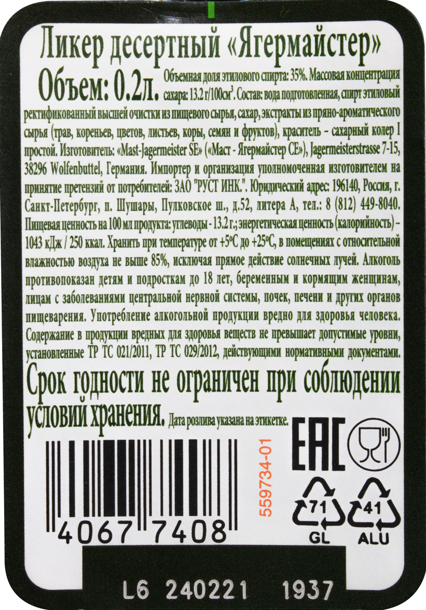 Ликер Jagermeister, 0.2л — продукт, который изготавливают по традиционным технологиям, оптимально комбинируя 56 натуральных растительных компонентов. В их числе экзотические травы и коренья, специи и фрукты, семена и древесная кора. Букет ликера раскрывается нотами кардамона, имбиря, апельсиновой цедры, а также оттенками цитрусов и карамели. В период настаивания экстракта в дубовых бочках он дополнительно насыщается древесными ароматами и кислородом. На вкус готовый алкогольный напиток получается сладким, а в его цвете преобладает темно-коричневая гамма. Крепкий травяной ликер можно использовать в качестве дижестива. Он ускоряет обмен веществ и улучшает пищеварение. Качественный десертный продукт подходит для питья в чистом виде или для смешивания с другими компонентами в основе коктейлей. Бутылка изысканного качественного напитка может стать оригинальным подарком близкому человеку, партнеру, коллеге и руководителю. Такой презент, наверняка, по достоинству оценит каждый получатель, а вы подчеркнете свой утонченный вкус.