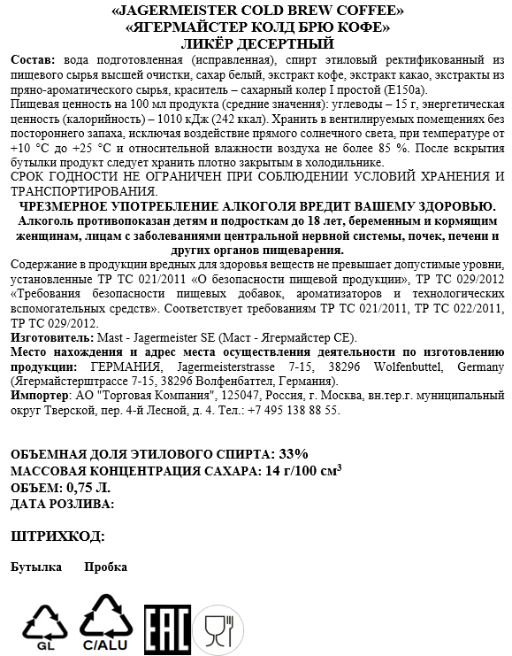 Ликер Jagermeister Cold Brew Coffee, 0.75л