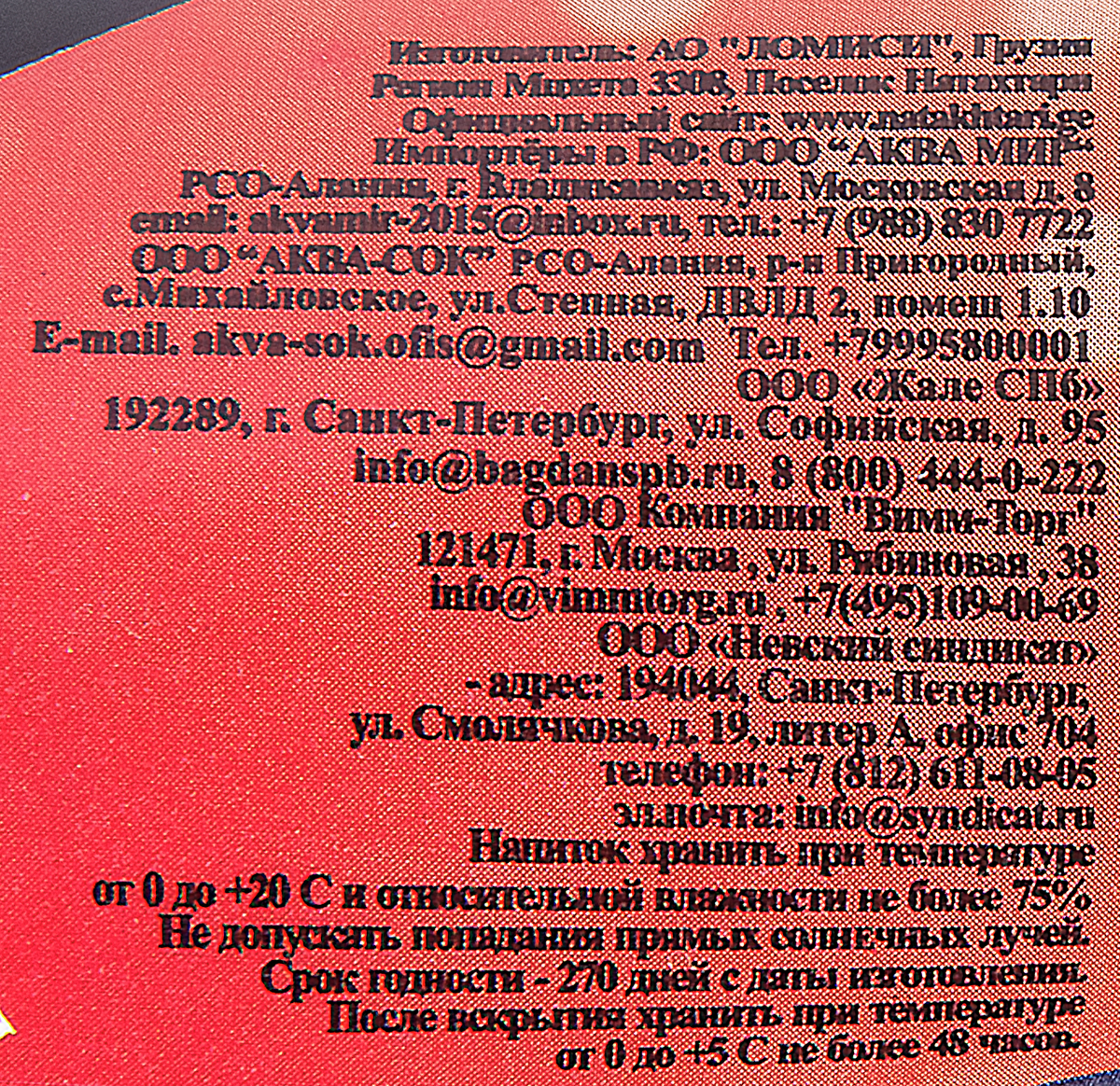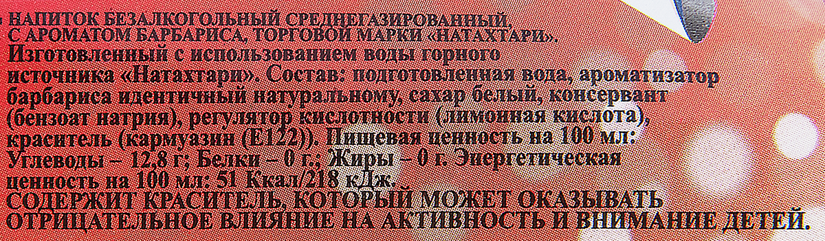 Напиток Натахтари Барбарис это превосходный безалкогольный сильногазированный сладкий напиток, с освежающим насыщенным ягодным вкусом и нежным манящим ароматом. А благодаря упаковке в стеклянной бутылке, сохраняются все вкусовые качества продукта. Изготавливается популярный сладкий напиток на основе специальной родниковой воды, обладающей лечебными свойствами, с добавлением натурального ягодного сиропа. Для лучшего восприятия неповторимого вкуса, Натахтари рекомендуется употреблять в охлажденном виде.