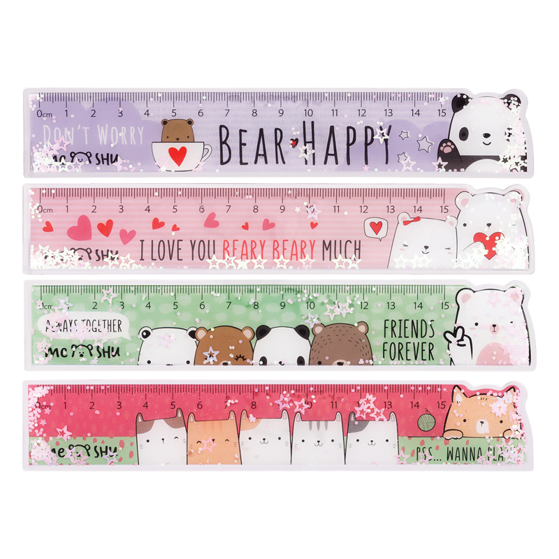 Линейка c блестками Beary beary создаст прекрасное настроение для учебы и творчества. Длина шкалы 15 см, ширина линейки – 35 мм. Гибкая линейка изготовлена из ПВХ. Представлено 4 милых дизайна с медвежатами. Линейка предназначена для чертежных работ. Упакована в пакет.