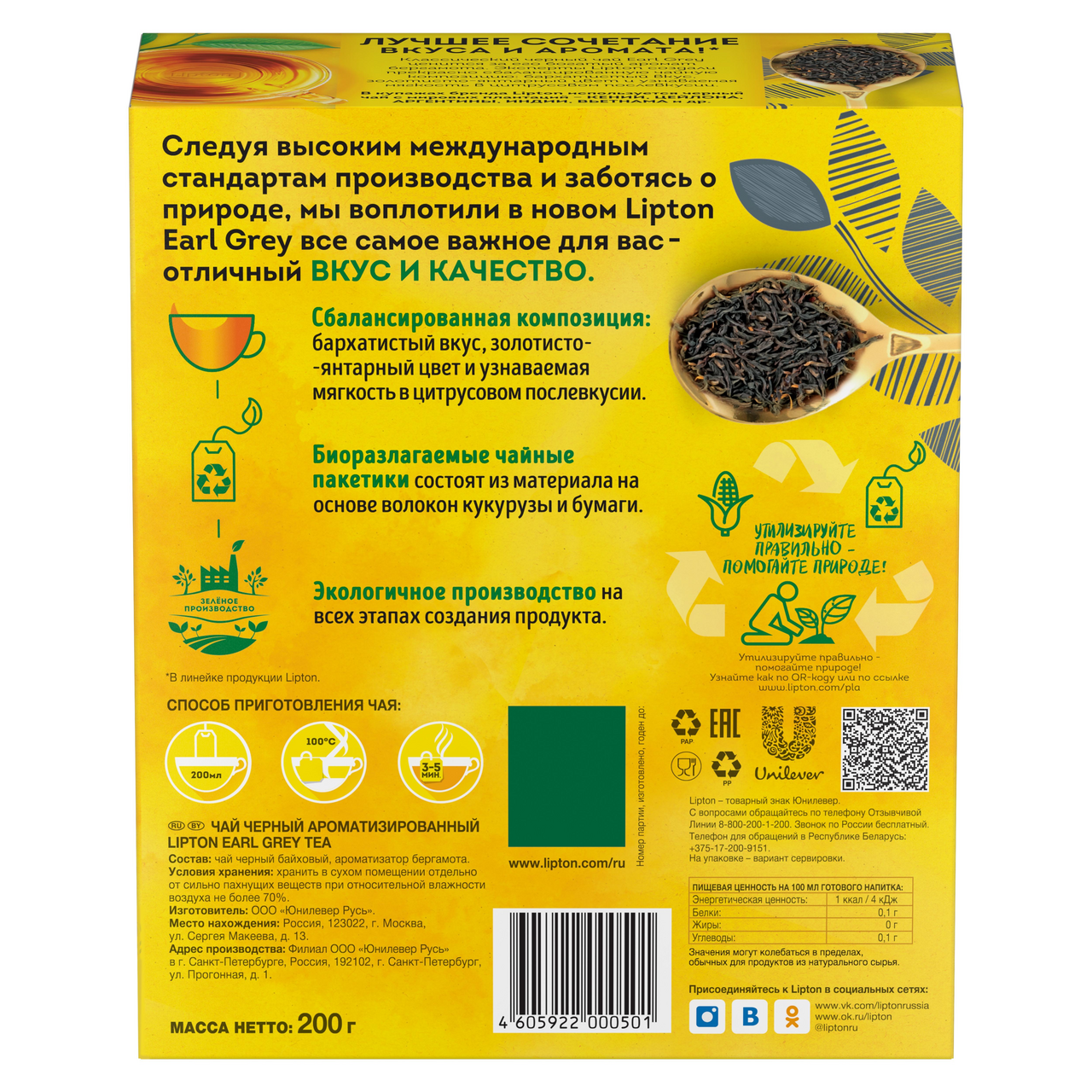Черный чай Lipton Earl Grey – это традиционный напиток, рожденный под жаркими лучами солнца. Этот классический черный чай ценится за его богатый аромат бергамота. Бархатистый вкус и золотисто-янтарный цвет напитка составят приятную компанию сонным воскресным утром или уютным вечером после долгого рабочего дня, а узнаваемая мягкость в цитрусовом послевкусии оставляет приятный шлейф после чаепития, наполненный гармонией и бодростью для новых начинаний.Получить классический вкус черного чая c бергамотом можно только при правильной заварке. Мы рекомендуем заливать чай в пакетиках водой (около 100 градусов) на 2-3 минуты, пока цвет напитка не станет янтарным. В этот момент отборные чайные листочки отдают напитку свой чарующий аромат. Любите покрепче? Оставьте пакетик в чашке еще на пару минут и сможете ощутить терпкий яркий вкус, насыщенный танинами.С каждым годом Lipton стремится бережнее относиться к природе. Бренд сделал еще один важный шаг к экологичности – 100 чайных пакетиков Lipton Earl Grey теперь состоят из биоразлагаемых растительных материалов на основе волокон кукурузы и бумаги. Чайные пакетики при правильной утилизации не наносят вреда окружающему миру. Картон, из которого изготовлена упаковка, имеет сертификат UFS – это значит, что при изготовлении упаковки вместо использованного дерева обязательно высаживают новое. Чайный лист для бренда Lipton выращивают на экологически сертифицированных плантациях, где бережно используются природные ресурсы, а также заботятся о людях, участвующих в производстве чая, улучшая социальные, экологические и экономические условия их жизни.
