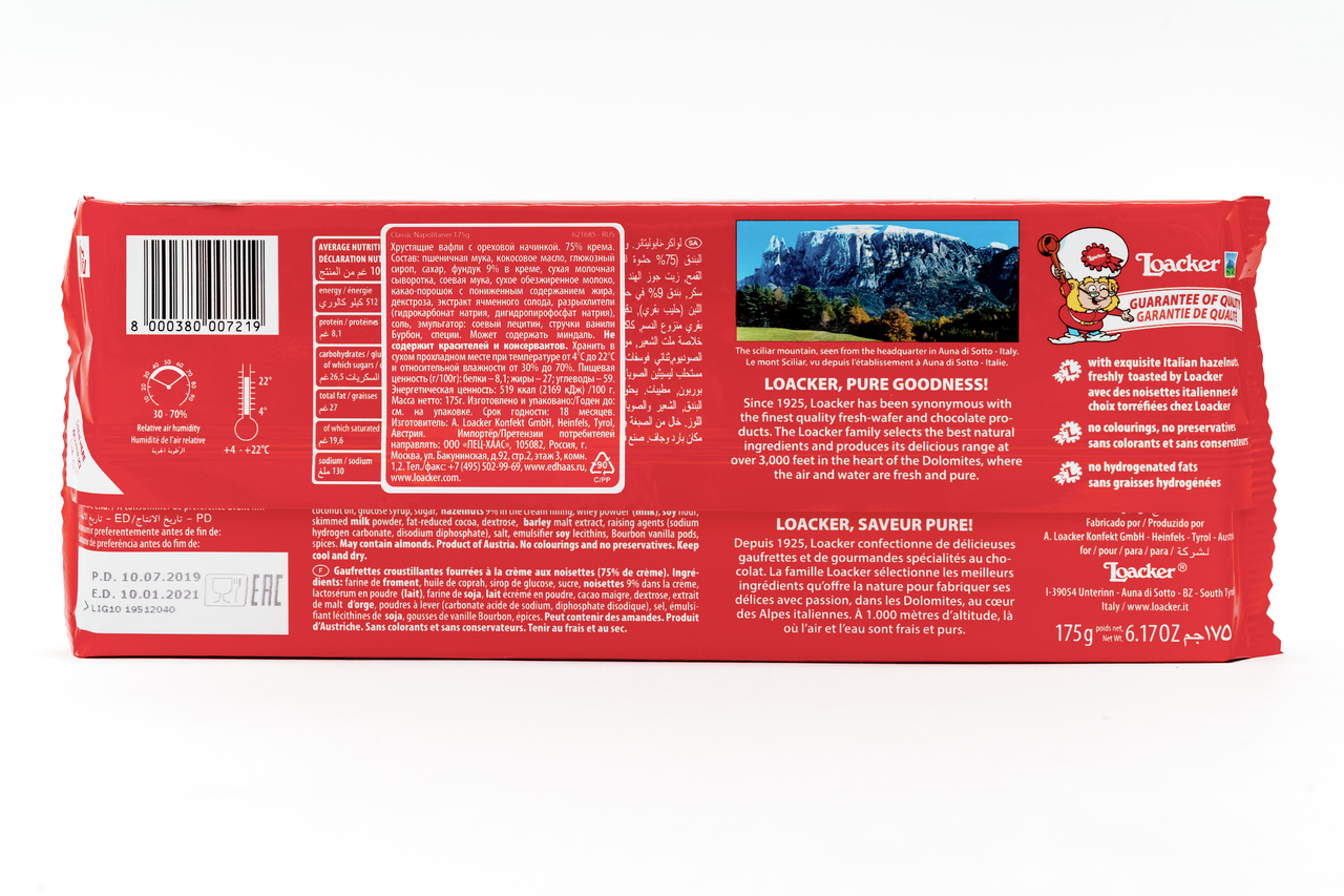 Вафли Loacker – лакомство премиального качества. Никаких искусственных ароматизаторов и консервантов, трансжиров и ГМО. В составе – альпийское молоко, фундук из Неаполя, ваниль с острова Бурбон и другие натуральные ингредиенты. Состав: альпийское молоко, фундук из Неаполя, ваниль с острова Бурбон и другие натуральные ингредиенты. Бренд с 1925 года производит вафли и по праву считается лучшим в своем деле. Хрустите ими отдельно от других блюд или дополните кофе, чай, мороженое, возьмите с собой вместо перекуса — в любом случае вы оцените их по достоинству.
