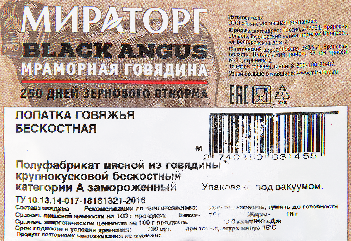Лопатка Мираторг говяжья без кости свежемороженая, ~4.2кг