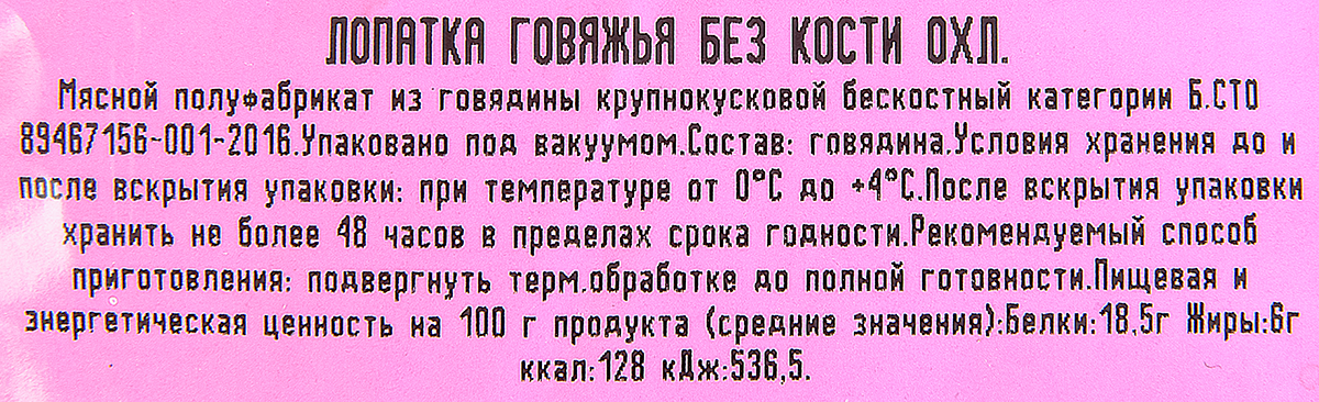 Лопатка говяжья без кости охлажденная вакуумная упаковка Мясо есть! – крупнокусковой бескостный полуфабрикат из мяса говядины. Заключен в вакуумную, прозрачную упаковку, благодаря которой отлично сохраняются, все вкусовые качества продукта и мы прекрасно видим товар, который хотим купить. Говядина богата витаминами В1, В2, В4, В6, В9, В12, Е, Н, РР и микроэлементами: калий, кальций, магний, натрий, сера, фосфор, хлор, железо, йод, кобальт, марганец, медь, молибден, никель, олово, фтор, хром, цинк. Благодаря такому богатому составу полезных веществ, это мясо при употреблении нормализует микрофлору кишечника, восполняет заряд энергии, показано спортсменам при физических нагрузках, помогает при анемии, для работы мозга, защищает о��ганизм от стресса. Из лопатки можно приготовить жаркое на сковородке, оно получиться невероятно сочным, ароматным и нежным, можно потушить с грибами, запечь в духовке, завернуть в фольгу с чесноком и специями, в мультиварке, с картофелем и овощами.