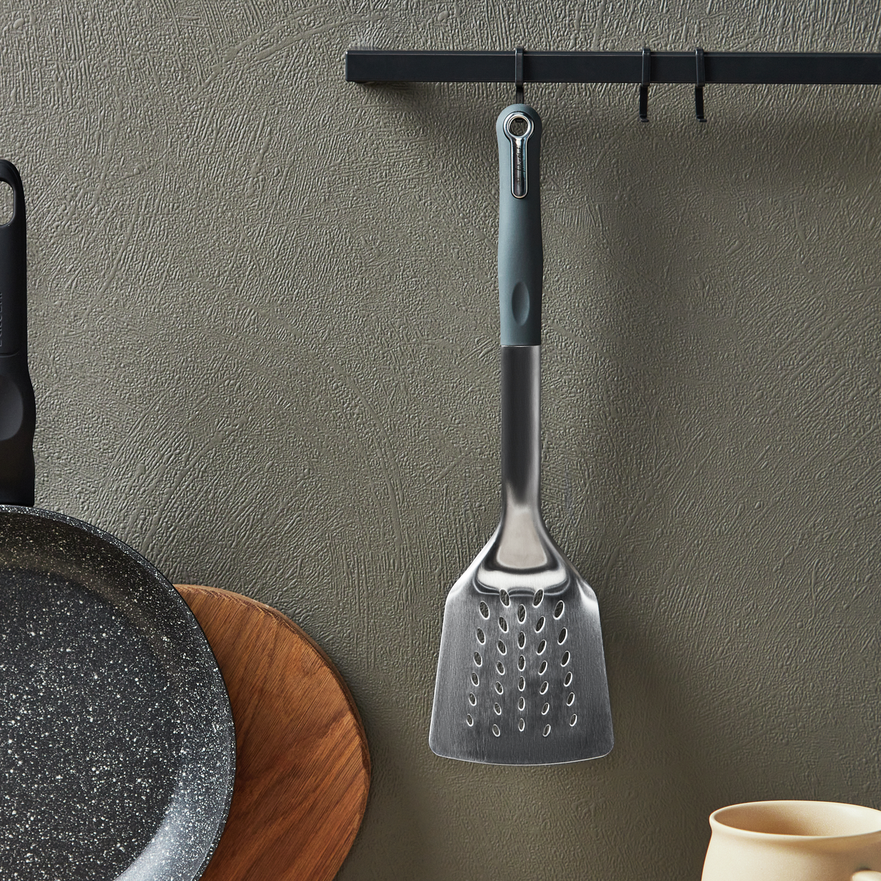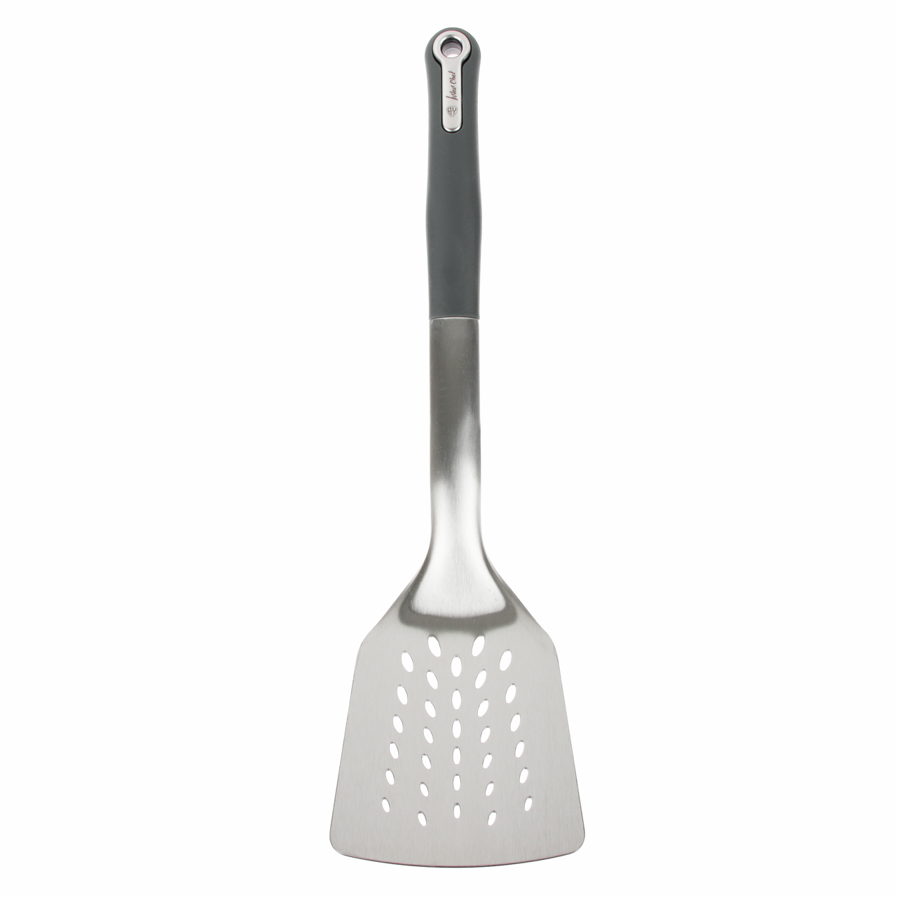 Лопатка Ivlev Chef Fusion с прорезями, 34 см незаменима в быту. Она позволит легко и быстро перевернуть на сковороде или противне жареный картофель, мясо, птицу и рыбу. А за счет специальных отверстий на рабочей поверхности масло не попадает на продукт при переворачивании, что исключает риск возгорания и задымления. Лопатка выполнена из качественной нержавеющей стали, устойчивой к коррозии и пищевым кислотам. Этот материал не впитывает запахи и не окрашивается в другой цвет. Благодаря эргономичной конструкции и накладкам на ручке изделие удобно ложится в ладонь и не выскальзывает из нее. Очищать лопатку можно как ручным способом, так и в посудомоечной машине.
