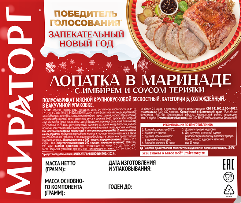 Вернуться назад Лопатка свиная Мираторг маринад имбирь и терияки охлажденная, ~1.15кг Оставить отзыв Артикул: 669767 Поделиться В избранное Раскупили Сообщить о поступлении Посмотреть похожие Узнать наличие в магазинах Бренд МИРАТОРГ Страна-производитель Россия Подробнее Описание Цельный кусок мясной мякоти лопатки с толщиной шпика на поверхности 2-3мм, поверхность которого равномерно покрыта маринадом, упакованный в термопленку. Можно запечь или пожарить. Полное описание Характеристики Бренд МИРАТОРГ Страна-производитель Россия Раскупили Сообщить о поступлении Посмотреть похожие Узнать наличие в магазинах