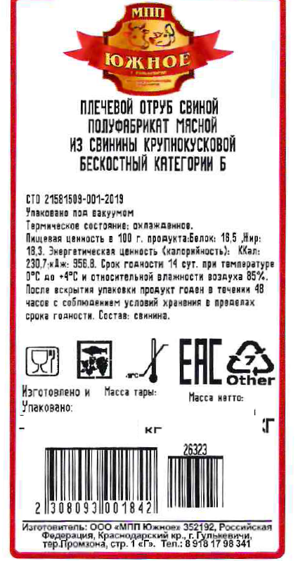 Лопатка свиная МПП Южное без кости охлажденная, ~9кг