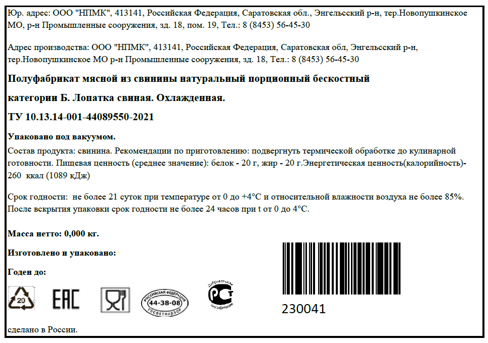Лопатка свиная Новопушкинский МК охлажденная, ~600г
