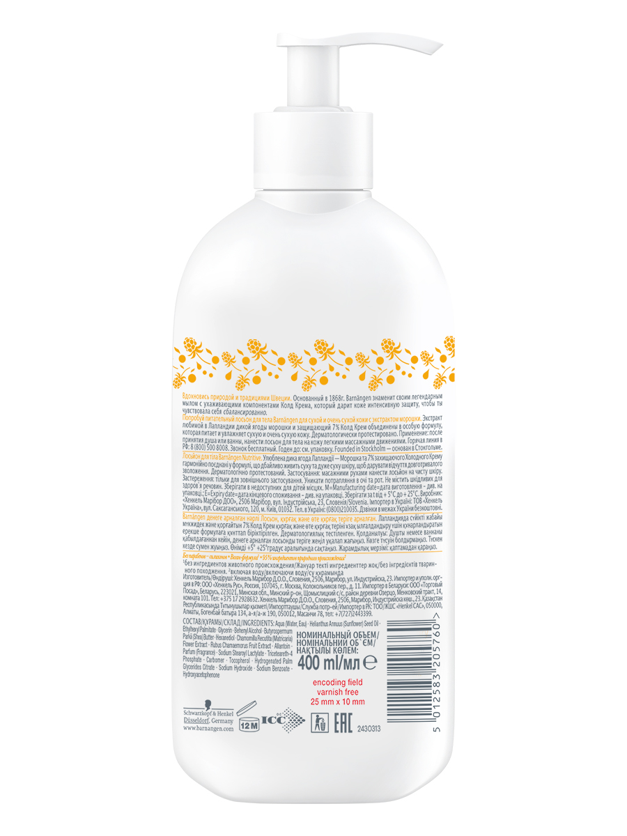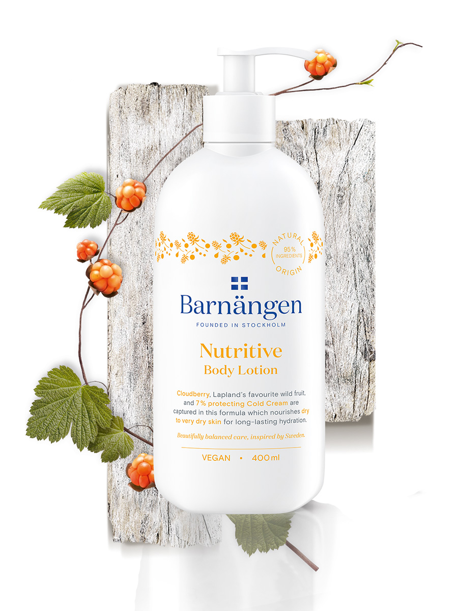 Вдохновись природой и традициями Швеции. Основан в 1868г. Barnangen знаменит своим легендарным мылом с ухаживающими компонентами колд крема, который дарит коже интенсивную защиту, чтобы ты чувствовала себя сбалансированно. Попробуй питательный лосьон для тела Barnangen для сухой и очень сухой кожи с экстрактом морошки. Экстракт любимой в Лапландии дикой ягоды морошки и защищающий 7 % колд крем объединены в особую формулу, которая питает и увлажняет сухую и очень сухую кожу. Без парабенов - силиконов.