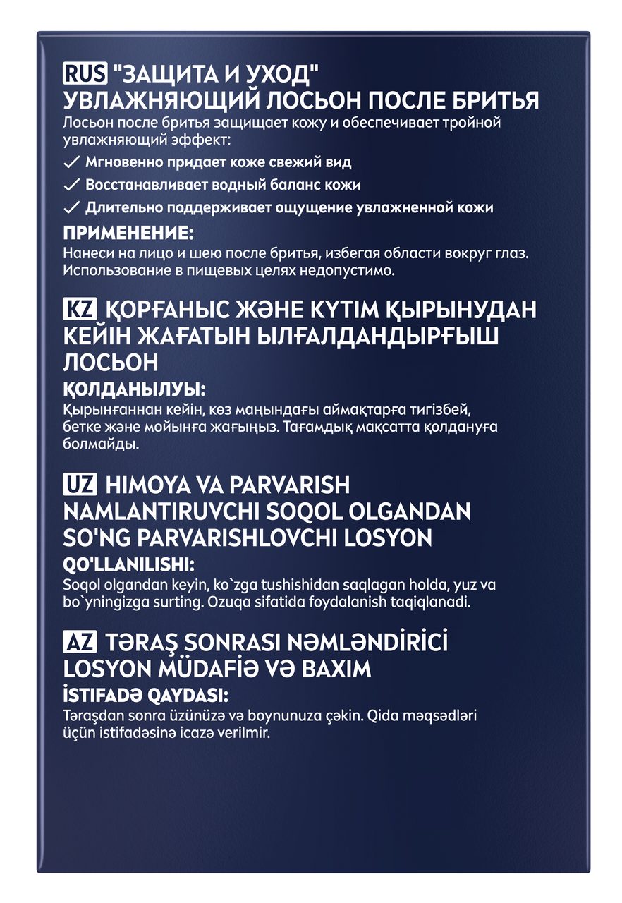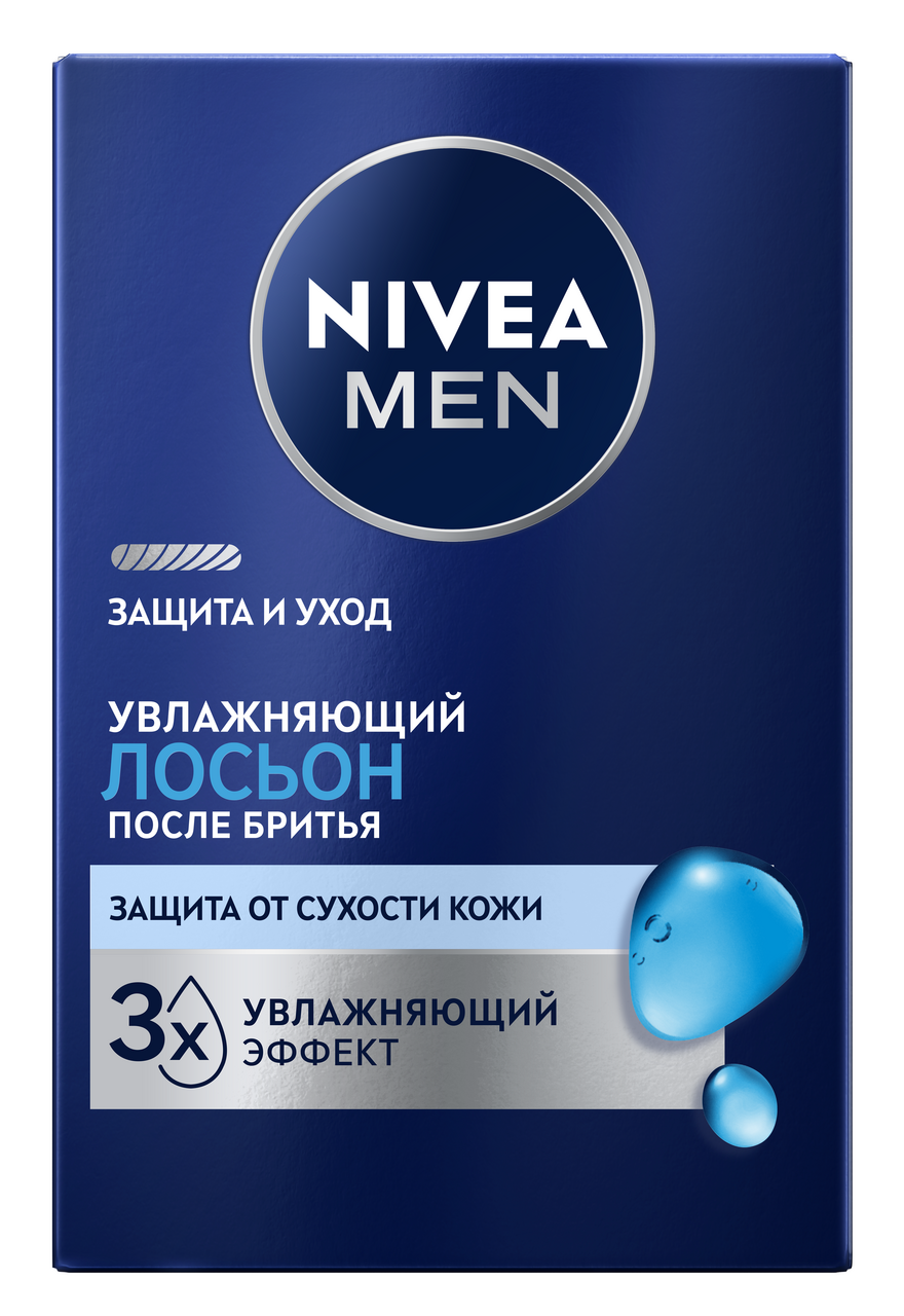 Надежная защита и уход для Вашей кожи. Попробуйте увлажняющий лосьон после бритья Защита и уход с Алоэ Вера для всех типов кожи от Nivea Men. Формула лосьона с Алоэ Вера и Про-витамином B5 ухаживает за кожей и защищает ее от внешних воздействий, вызывающих сухость. Средство после бритья смягчает кожу после бритья, увлажняет, снимая ощущение стянутости, защищает кожу от сухости. Дерматологически протестировано. Рекомендуется использовать совместно с пеной или гелем для бритья из увлажняющей линейки Защита и уход Nivea Men для защиты от сухости кожи.Применение: Используйте пену или гель для бритья, побрейтесь и умойтесь водой, после чего налейте небольшое количество средства после бритья в ладонь, нанесите на лицо и шею после бритья аккуратными массирующими движениями, избегая области вокруг глаз.