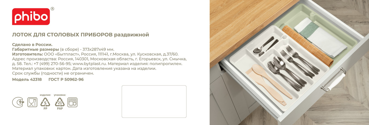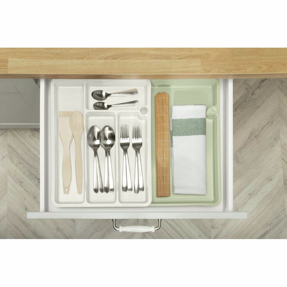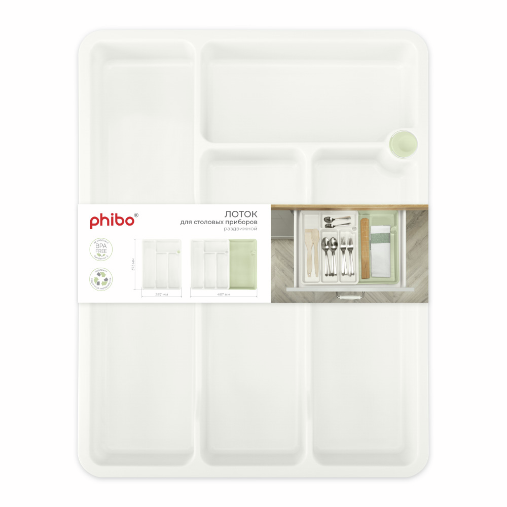 Раздвижной лоток для столовых приборов позволяет максимально использовать пространство кухонного ящика. Четыре отделения разного размера и одно выдвижное отделение позволят удобно расположить столовые предметы, отделив их друг от друга. Лоток подходит для любых кухонных ящиков. Ширина лотка регулируется благодаря раздвижному механизму от 29см до 49см. Лоток выполнен из износостойкого пищевого пластика, устойчивого к царапинам, легко моется и не впитывает запахи. Можно мыть в посудомоечной машине.