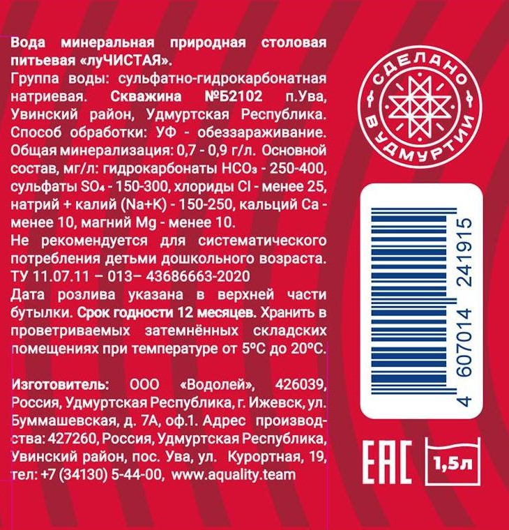 Вода Увинская Жемчужина луЧИСТАЯ Aquality минеральная природная столовая питьевая газированная, 1.5л
