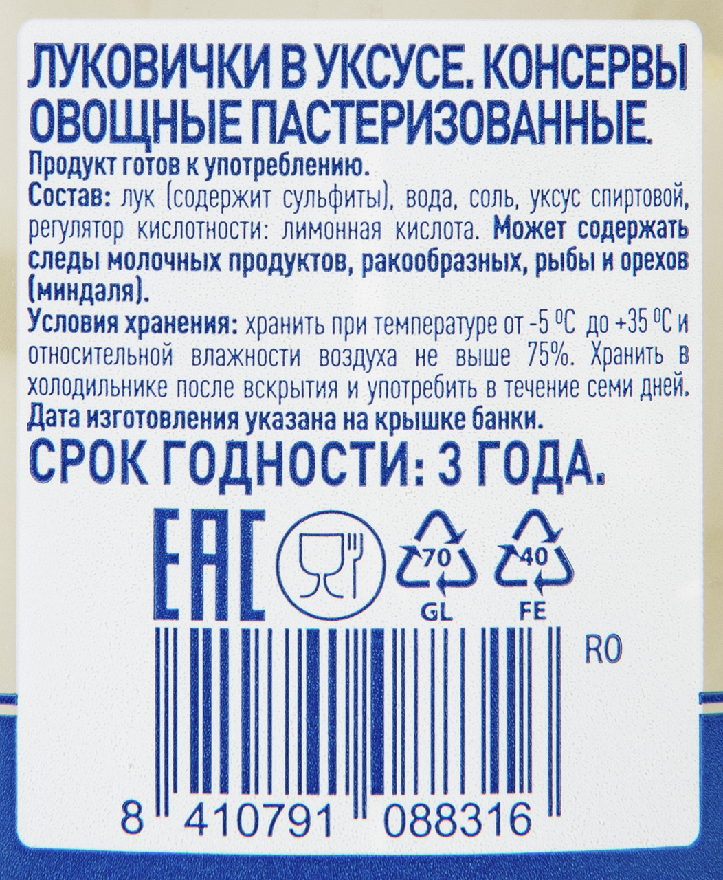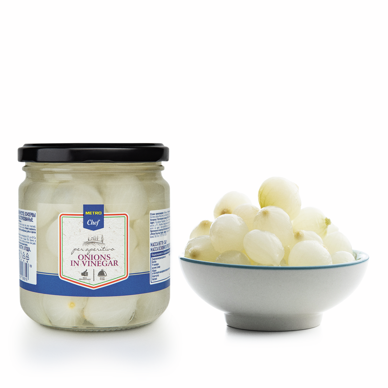 Луковки в винном уксусе Metro Chef, 340г – овощные консервы в пряной заливке, которые помогут вам в приготовлении оригинального блюда, придадут ему изысканный вкус. Луковки одинакового миниатюрного размера, хрустящие и пикантные. Их можно добавить в свежий овощной салат, в первые и вторые блюда, в закуски и всевозможные заправки, в несладкую выпечку вроде пирогов и пиццы. Ими также можно сопроводить брускетты и прочие закуски, которые оригинально дополнят собой даже праздничное меню. В продукте мало калорий – всего 14,8 ккал на 100 граммов, - поэтому он не навредит фигуре. Овощные консервы поставляются в банке с плотно завинчивающейся крышке, за счет чего их длительное время можно хранить в холодильнике. А благодаря большому объему в 340 граммов продукта хватит на длительное время.