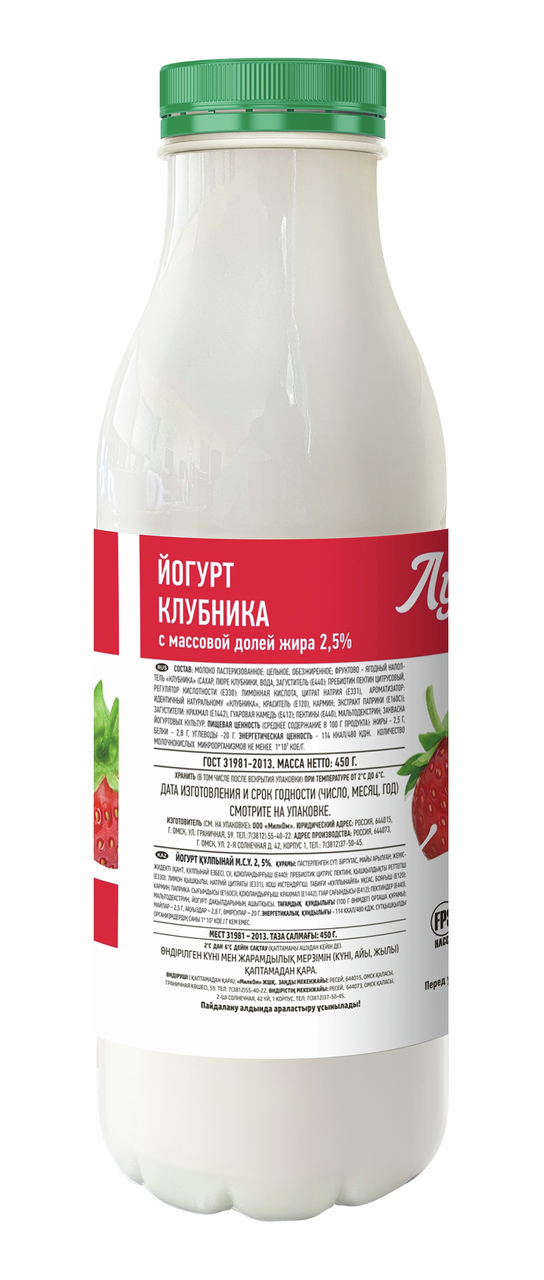 Йогурт Лужайкино изготовлен из натурального коровьего молока, нормализованного по массовой доле жира, йогуртовой закваски и фруктово-ягодного наполнителя Клубники.