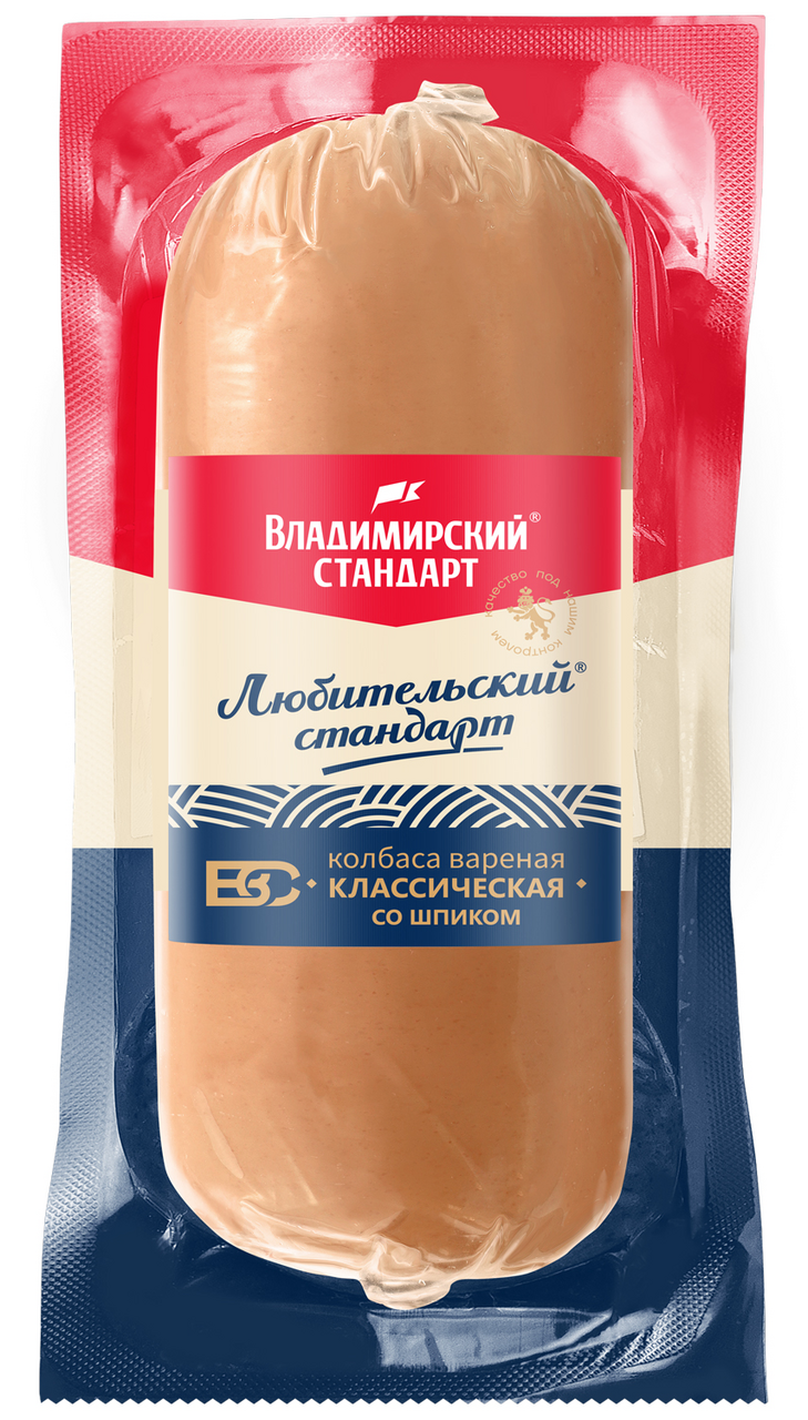 Колбаса Владимирский стандарт Классическая со шпиком, ~1.4кг отличный продукт со сбалансированным вкусом и нежным ароматом классической вареной колбасы. В составе присутствует минимальное количество стабилизаторов и фиксаторов окраски, нет грубых прожилок и комочков. Отлично подойдет для утреннего бутерброда или сэндвича на работу, приготовления различных классических блюд, в том числе шкворчащей яичнице на раскаленной сковороде.