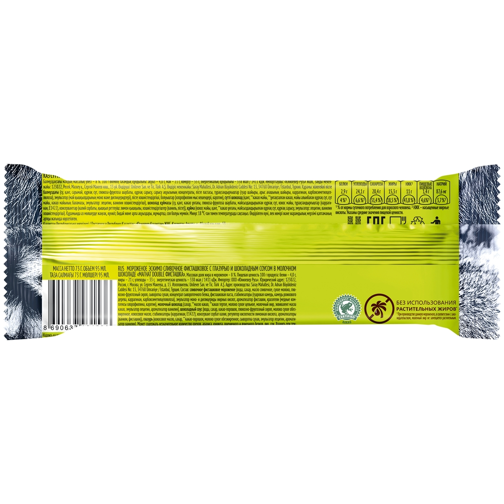 Следуй своим инстинктам с Магнат Double Фисташка. Уникальная двойная капсула из 100% шоколада, жидкого шоколадного соуса, и глазури из какао-бобов создает дерзкую комбинацию, оригинально подчеркивая вкус фисташкового мороженого. Охота за удовольствием началась.Мороженое Магнат – это идеальный баланс премиального шоколада и сливочного мороженого.Именно бескомпромиссный подход к выбору настоящего шоколада и исключительный вкусовые характеристики делают эскимо Магнат особенным.Магнат по праву является экспертом в шоколаде. В коллекции бренда собраны все виды шоколада непревзойденного качества.Магнат не только разбирается в особенностях настоящего шоколада, Магнат его исследует: на базе разработок компании Юнилевер (производитель) установлена лаборатория по замеру уровня хруста шоколада Магнат. Характерный хруст – вот, что отличает настоящий шоколад Магнат.Магнат постоянно в поиске новых вкусовых сочетаний, так как призван удивлять и открывать новые грани вкусов и удовольствий для своих потребителей.Коллекция Магнат состоит из нескольких линеек и форматов премиального мороженого.Коллекция эскимо – это лучшие, яркие вкусы, любимые потребителем бренда Магнат: Шоколадный Трюфель, Манго и Красные Ягоды, Горький Шоколад и Апельсин, Миндаль, Брюнетка. Все виды шоколада: Белый, Молочный, Горький. И максимальное удовольствие.Коллекция Магнат-Мини – это мини-формат эскимо, для тех, кто не хочет выбирать и готов наслаждаться моментом удовольствия только для себя или в компании друзей.Коллекция эскимо Магнат Double – это премиальная линейка бренда Магнат, выполненная в уникальной технологии двойной шоколадной капсулы, и запечатанным соусом внутри.Коллекция пинт Магнат Double – это уникальная технология двойной шоколадной капсулы в формате пинты, которую можно заказать домой. Нажмите на упаковку! И характерный хруст шоколада Магнат не заставит себя ждать. При нажатии на пинту шоколадная капсула ломается, а крупные кусочки молочного шоколада проникают в сливочное мороженое. Неподражаемое удовольствие.Магнат создает исключительное мороженое и повод для истинного удовольствия.Магнат верит, что день без удовольствия – день, прожитый зря. Поэтому мороженое Магнат создано специально для искателей удовольствия. Для тех, кто верит, что удовольствие делает жизнь значимой. Смелых и бесстрашных. Следующих за своим удовольствием, свободных от страхов и осуждений, для тех, кто позволяет себе чувствовать свободу и просто наслаждаться жизнью каждый день вместе с Магнат.Магнат. Твои правила удовольствия.