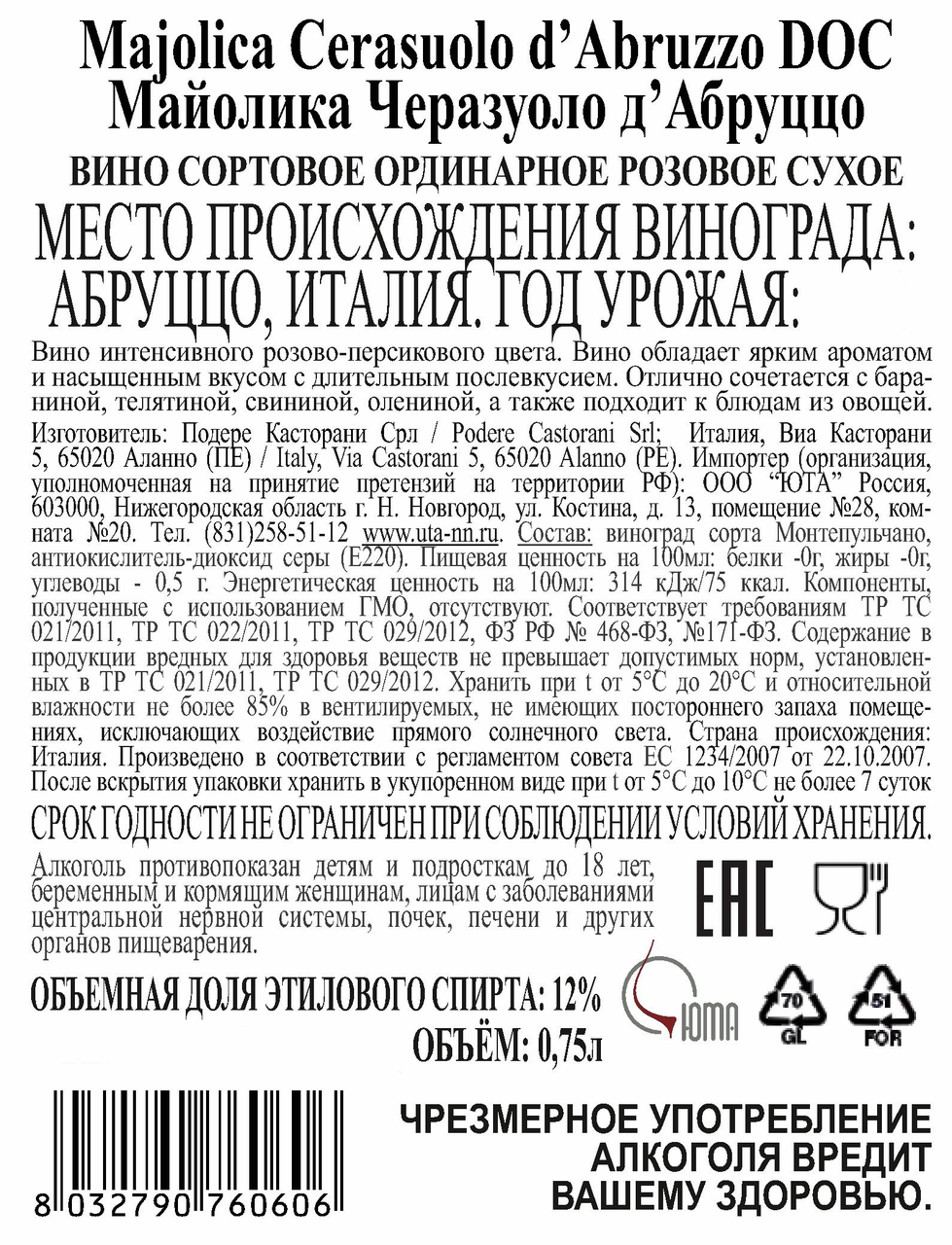 Majolica Cerasuolo d'Abruzzo DOC — насыщенное и одновременно легкое розовое вино с оттенками вишни и небольшой кислотностью. Изготавливается из винограда сорта Монтепульчано, который выращивается на традиционной подвесной шпалерной системе “Пергола”, издавна использующейся в регионе Абруццо.Виноград собирается в первой половине октября вручную и тщательно отбирается. Краткая мацерация на кожице длится 12 часов, ферментация проводится при температуре 18 С. По окончании частичной малолактической ферментации вино выдерживается в чанах на протяжении 3-4 месяцев.