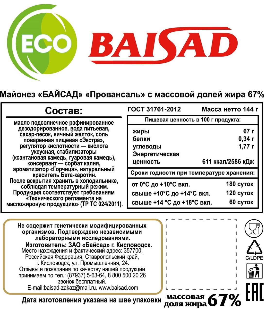 Майонез Baisad Провансаль 67%, 150мл