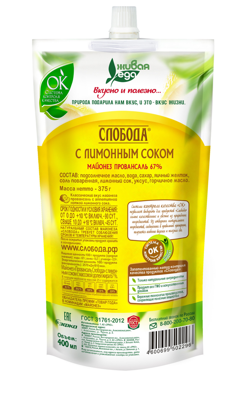 Слобода с Лимонным соком — яркий микс классического майонеза и сочного лимона. В состав майонеза входят только натуральные ингредиенты, а умеренная кислинка подчеркнет другие вкусы вашего блюда. Майонез с соком лимона прекрасно подходит для заправки салатов с морепродуктами и рыбой, сочетается с запеченной курицей или овощами, а также является идеальной основой домашних заправок и маринадов. Дайте волю кулинарной фантазии и удивляйте близких оригинальными рецептами! Слобода — бренд, который знают и любят многие россияне уже на протяжении 30 лет. Все продукты Слобода отличаются настоящим вкусом и неизменным высоким качеством. Они не просто соответствуют ГОСТу, а обладают настоящей силой природы и производятся с заботой о будущем!