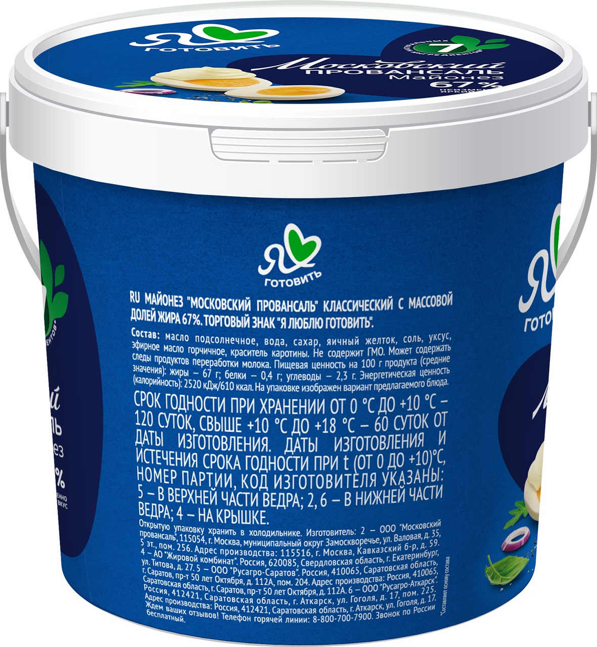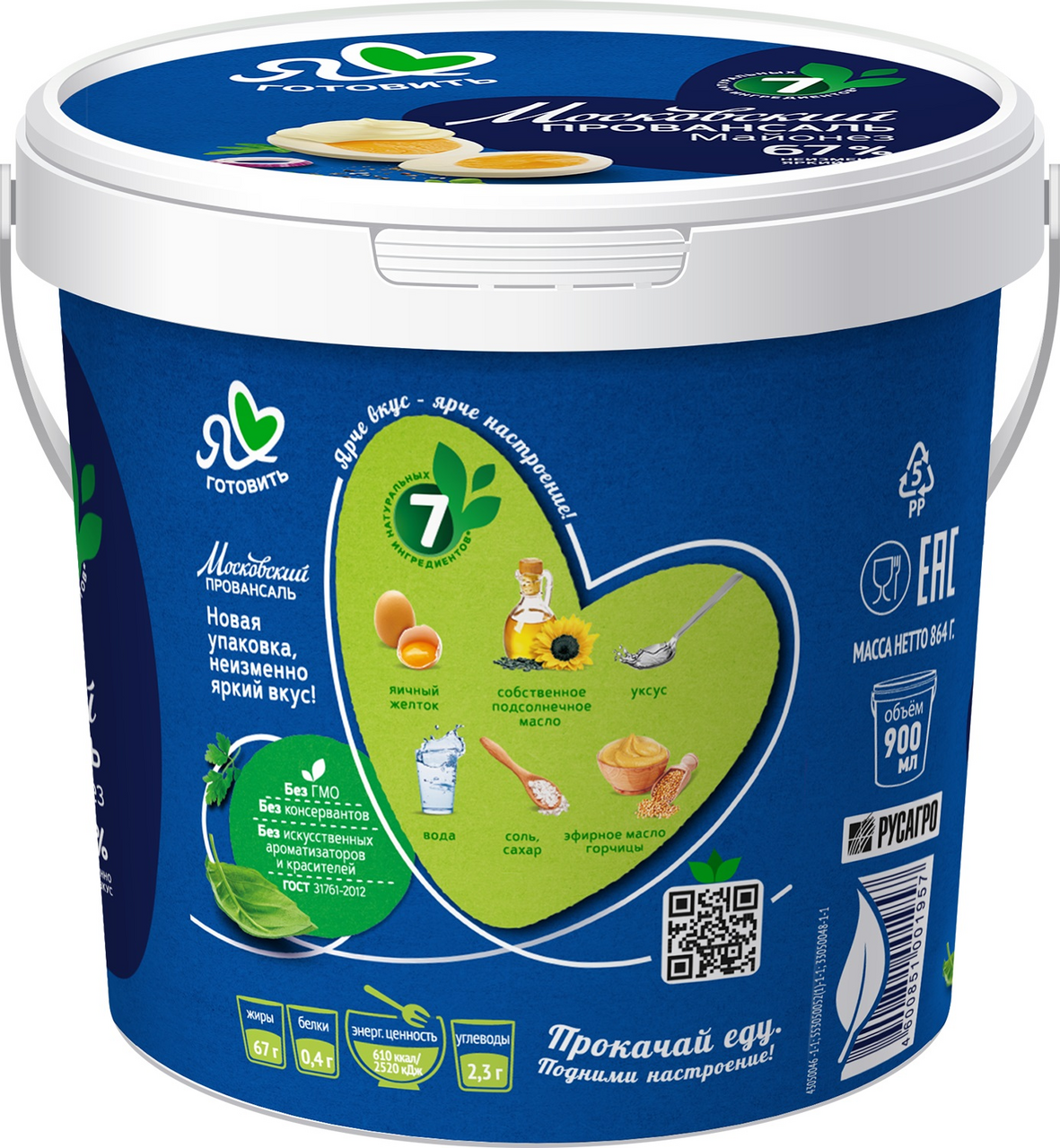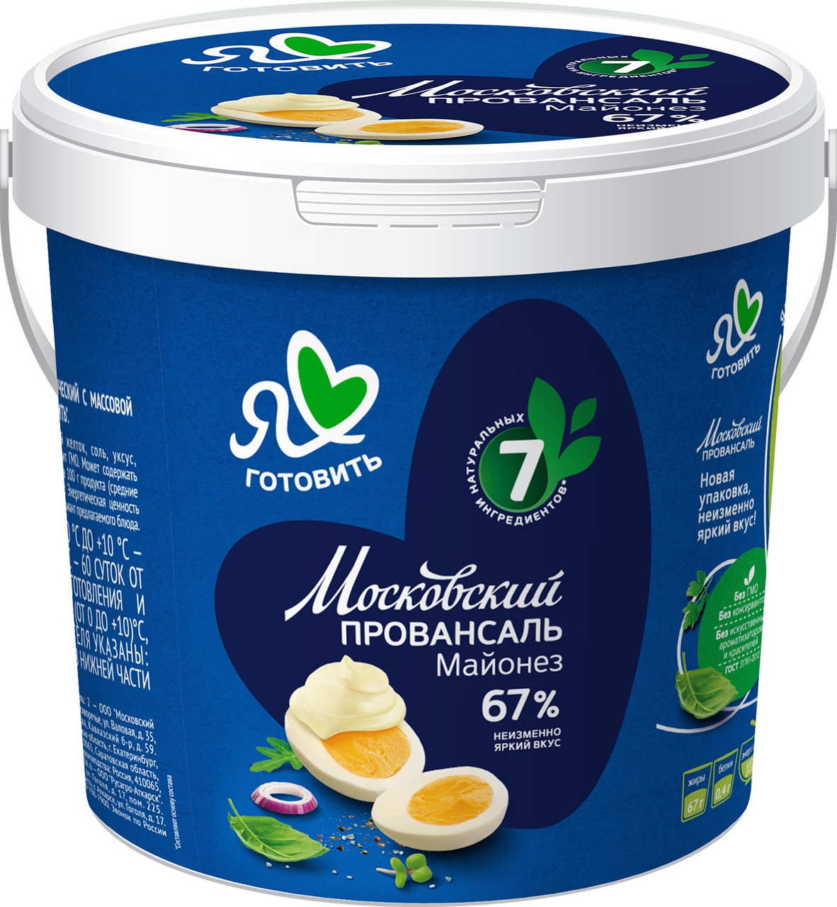 Майонез Я люблю готовить Московский Провансаль 67%, 900мл в удобном ведерке сделает приготовление блюд еще более приятным и творческим занятием. Его классический вкус хорошо подойдет в качестве основы к разнообразным соусам, а нежная консистенция равномерно распределится по поверхности. Майонез станет отличной заправкой для салатов, он активно используется на многих профессиональных кухнях, как один из основных ингредиентов блюд. Хозяйки любят майонез за его качество, которое успели оценить несколько поколений отечественных покупателей. Его производят по старинным рецептурам, на основе натуральных ингредиентов.